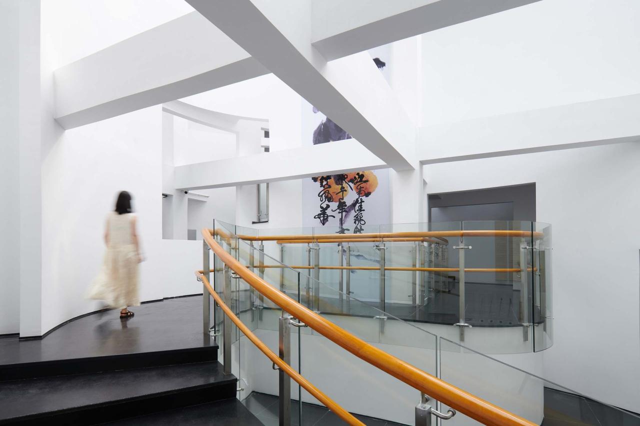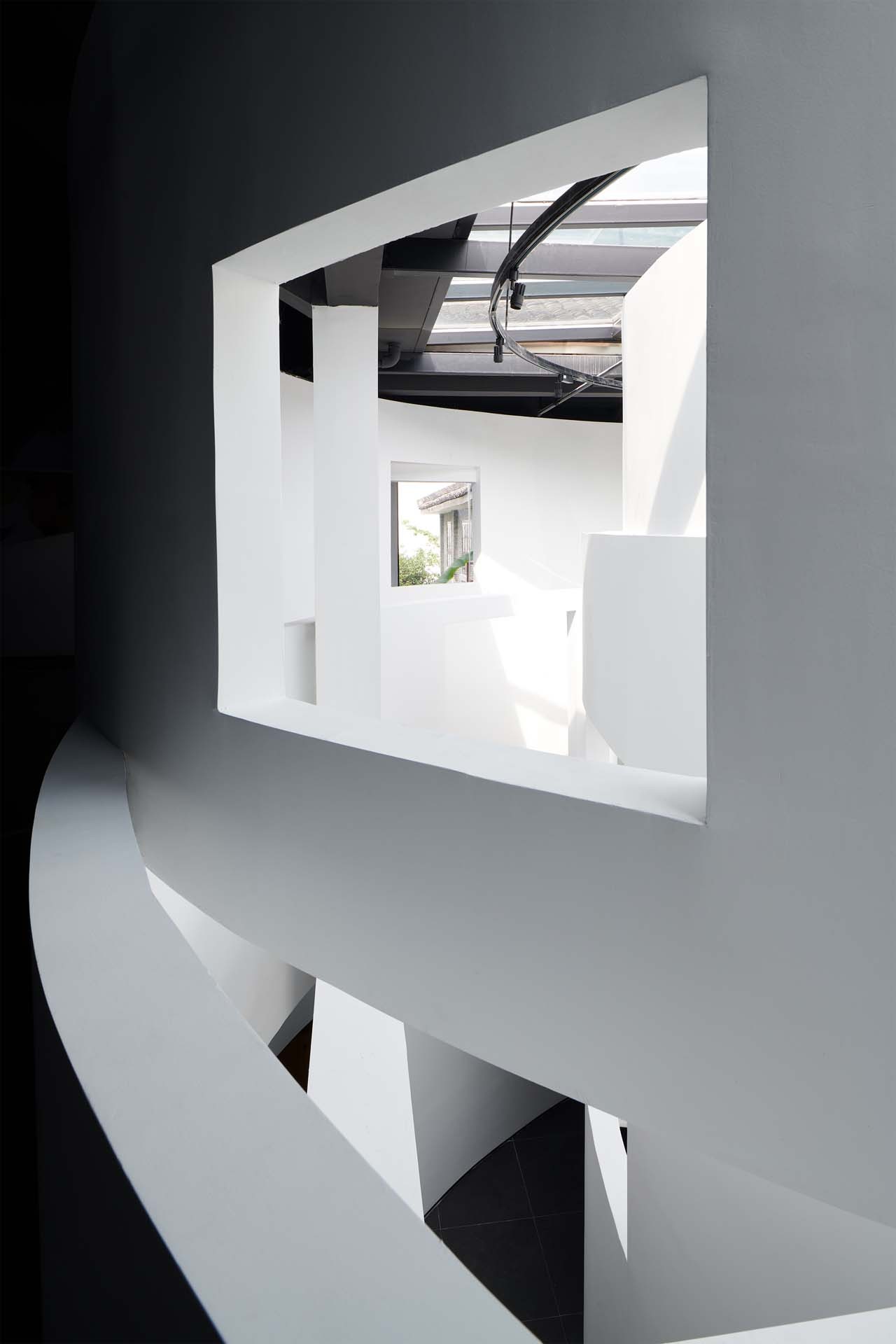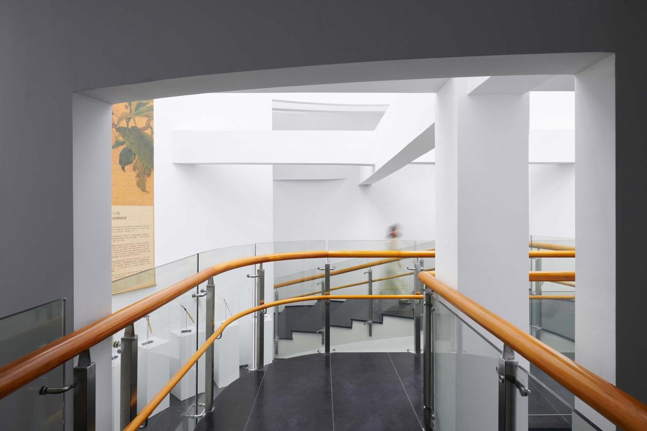 因此这种观看方式更接近于园林中对空间的理解,通过窗体进行框景、借景。在园林中,假山是一种实体的庭院,而“重环”也可以说是一种“假山化”的中庭,在并不空旷的空间内,以上升到顶点的体量感占据了成了实体,同时将光线最大化的收缩其内侧,在而错综复杂的内部空间中营造出一种“抽象的自然”。更诗意的在于所有的叙事结构都在结束处达到高潮,当参观者经历了完整的空间感知后,真实的自然和绿意与明亮的光线都随着弧形的路径缓缓地在眼前扑展开来,通透的玻璃界面使参观者置身于超时空的自然切片中,让窗外何思敬纪念馆的一角也被带入整个参观的一部分,两个展馆如此隔空相望,一瞬间时间、空间、真实、抽象都在此碰撞开来。