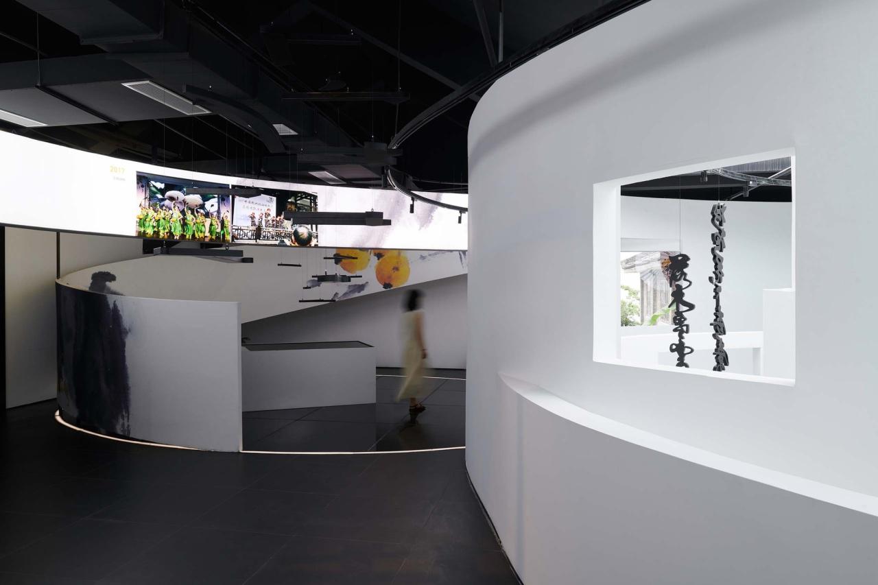 由于建筑处于塘栖大运河古镇文化带中,因此对建筑外部风貌的处理在尊重原有古镇立面的统一性中进行了部分的有机更新:设计上保留了立面上半部分的传统风貌,二层对外的花格门窗都被完整保留;而一层部分则使用了更现代的“类斗拱式”的当代转译木构搭接成入口雨廊,在其背部用打孔铝板绘制了枇杷果实的剪影。上一半属于过去,下一半属于未来,它们共同建立了一种对传统古镇风貌回应的态度。而在这个古镇立面表皮的内部,则呈现出了一个与外部完全差异的另外一番天地,我们希望博物馆内部是一个沉浸式的、异于外界的乌托邦。因此,在这个内部空间中我们打破一二层相互隔绝的状态,置入了一个贯穿了一二层空间的装置艺术体,并将它命名为——“重环”。