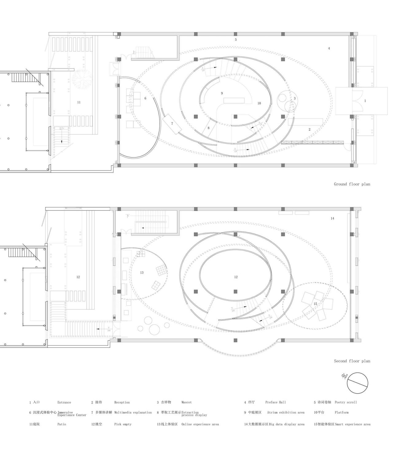 重环”之“环”:环形中庭“重环”是一个纯白色的多层的套环系统,它由一系列不同高度、不同大小的椭圆层层相套而成。“重环”创造了一个内部的环形中庭,由于“重环”对空间的塑造,使得体验者可以循着空间的轨迹渐渐发觉,建立了一种环形游历的过程。一如中国古老的传统画卷,观察的展开是非常缓慢且流畅的,人们会在游动的过程中带着对未知的疑问展开和探索空间。环形中庭可以让游览者在密集的展览内容过后长舒一口气,从长时间密集的阅读中解脱出来,转而投入对空间、自然、光线的感知中。环形平面结构的展览空间是一种特征强烈的空间原型,我们讨论过赖特的古根汉姆美术馆及巴埃萨的格拉纳达博物馆等环形中庭处理方式的对展览流线梳理的有效性,环形展厅可以通过一个环形上升的中庭,将层与层之间以一个平缓的道路连接起来,而展览空间则可以沿着周界布置,参观流线清晰且明确。