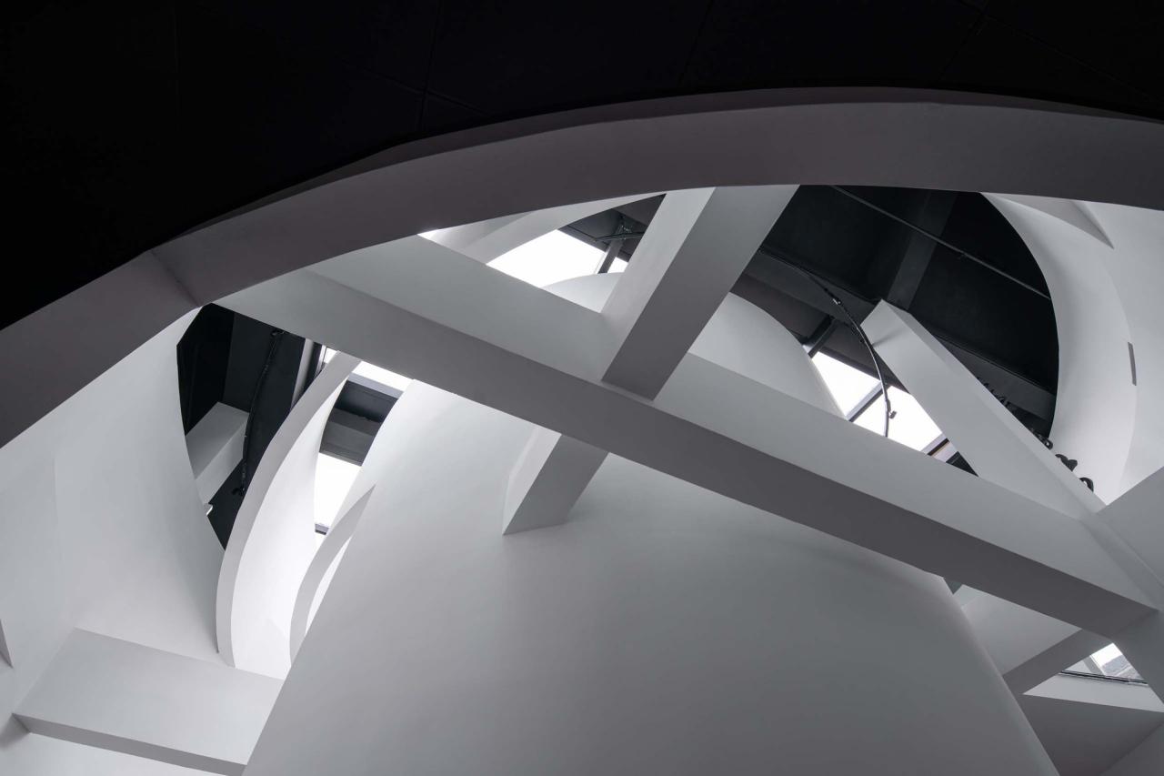 第二层是“穿越”。“穿越”是路径与“重环”间垂直穿越的关系。“重环”界面的多重性产生了一种层叠状态,“环”不再是一层单一的表皮,而是由缝隙与空间构成的,因此“穿越”的关系也便有了意义。在不断地穿越多个墙体的过程中,参观者会得到一种完全陌生的空间感知,墙体的厚度,墙体间的缝隙,看不见尽头的空间,都在这个穿越过程中开始显现。在参观的路径中,我们顺着环形的墙体上升到1.2米的高度后,开始水平向的行走在半空的廊道,并开始穿越这些墙体。与参观者一同穿越的还有原建筑结构,当行走的高度被抬升以后,人和梁的高度已经接近通过的极限,此时参观者已经非常的接近梁的高度,参观者可以清晰的在这一高度看到梁穿越弧形墙体的过程,这一瞬间都被定格成了画框。在看似“埃森曼式”的结构中,老结构与新构造被漆上共同的白色,消灭了他们在材质上的差异,进而单纯地保持其在几何形态上的碰撞和辨别力,建立起一种“白描”式的纯粹对话,让原有结构的力量感和新结构的力量感被同时强化了出来。