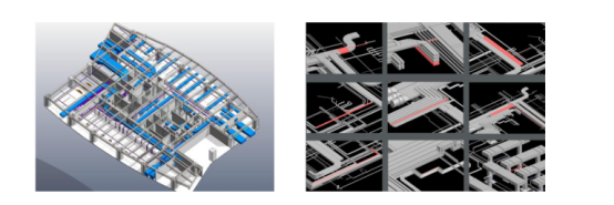 接着,在本工程中应用了碰撞检测功能,碰撞检测分析用于检查一个或多个模型在设计中存在的碰撞冲突,譬如结构与设备专业之间的检测,在结构梁柱位置固定之后,来检测设备管线是否与结构发生冲突,为了减少在施工阶段中的变更,在前期的设计过程中尽量减少不必要的错误,在本工程中,地下室及设备层的管线多而复杂,见图6,需要在设计过程中各专业配合仔细,用BIM进行碰撞检测分析,见图7,可以准确、清楚的发现在设计中出现的碰撞、专业冲突的问题,然后进行修改解决,真正实现了在设计数据和信息整合在同一平台之上,譬如,设备专业工程师在RevitMEP软件中进行修改之后,建筑师和结构工程师通过连接之后进行刷新,及时的获取更改信息,不必担心像传统设计两个不同专业之间数据衔接而造成的误差,这样就省下了工作时间,提高了工作效率。