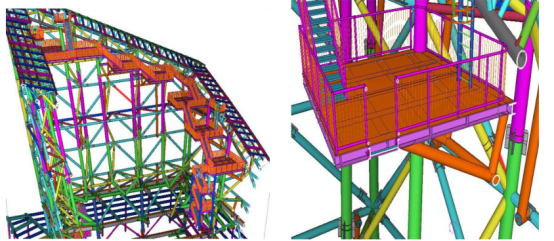 (d)卫星碟平台支撑架由7个卫星碟平台、2个卷扬机房平台、3个停泊平台以及连接这些平台的钢楼梯组成。平台框架均由H型钢组成,且全部为全焊接刚接节点,其中7个卫星碟平台位于皇冠内侧东、北两个面上,为带斜撑的悬挑结构。卫星碟平台通过钢楼梯相连,并最终通过钢楼梯直接与ROOF层相连。根据结构特点,此部分的施工顺序将按照从下往上,先安装屋面钢楼梯,再依次安装卫星碟平台与相连的楼梯,与之临近的卷扬机房平台与停泊平台在此期间穿插同时施工。见图11、12。单个卫星碟支撑架安装时应首先安装带斜撑的支撑架,然后再安装平台框架,以确保安装的结构为一个稳定体系。