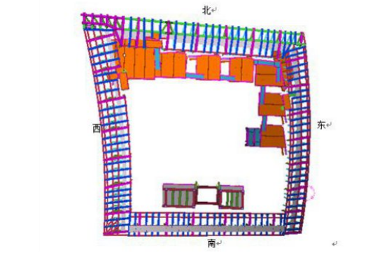 (2)结构特点:皇冠结构由不规则的“回”字型构成,由核心筒67夹层(L67M)开始抱箍向上延伸,延伸至L69层之后,在第4层位置(即核心筒顶部)经结构转换变为内外两排框架,内外框架之间通过水平桁架、屋顶桁架和其他斜腹杆相连形成空间管桁架结构。皇冠结构竖向共分10个结构层,其中西北角最高,为10层(标高34595m),东南角最低,为4层(标高311.880m),西南、东北两个角高度相同,为7层(标高328.555m),皇冠东西两侧为曲面。见图3、4。
