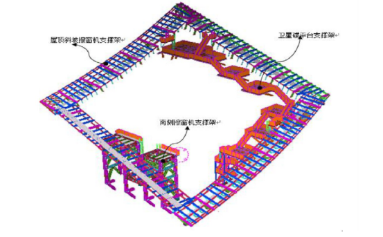 (4)施工难点:皇冠二次结构包含南侧擦窗机支撑架、屋顶斜坡擦窗机支撑架、卫星碟平台支撑架三大部分,根据总体施工进度计划要求,拟先安装南侧擦窗机支撑架,再安装屋顶斜坡擦窗机支撑架,最终完成卫星碟平台支撑架。施工安装次序的问题采用BIM进行施工模拟来解决。见图7。