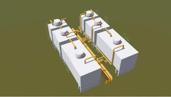 (3)其他:此外通过BIM技术可以直观的表达各机组的空间位置关系,对机房空间大小、走向等起到决定作用。Revit模型还可以优化建筑管道系统设计,使各专业管线关联起来,借助全面的建筑设备及管道工程解决方案,最大限度的简化工程项目。图16。在BIM模型中加入灯光效果,模拟建筑物在夜间的景观照明,展现3D动态效果,给业主方直观的视觉感受,方便业主做出方案决策。