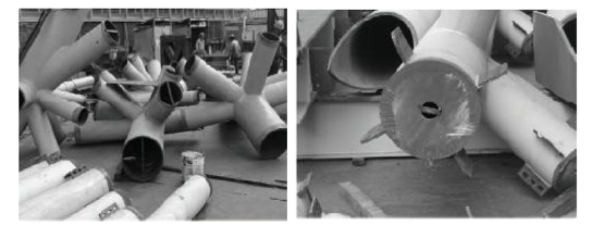 (a)铸钢节点在工厂内通过磨具整体浇筑,工序后续通过正火及调质等热处理,相对于焊接节点,可以免去焊接所带来的应力集中及残余应力。