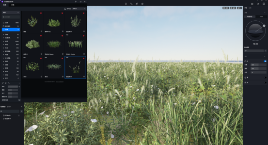 在自然-观赏草分类下找到草丛植物,首先选择草丛04,点亮左边缘笔刷(铅笔图案),将半径一栏拉满,调整密度、尺寸以及随机尺寸,点击草地,所选择的植物会散布在草地上面。