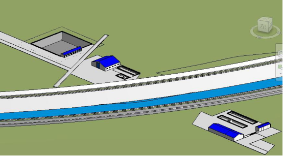 连续梁拱上跨中国南水北调干渠两侧进行BIM三维场地设计,施工现场布置应考虑水源污染的影响,以及跨干渠交通限制因素,拌合站、钢筋场、生活区设在主线里程DK245+500右侧,远离水源保护区,临时钢筋存放区、临时生活区、钢筋存放区等设在干渠左右两侧保护围栏200m外,如图7所示。