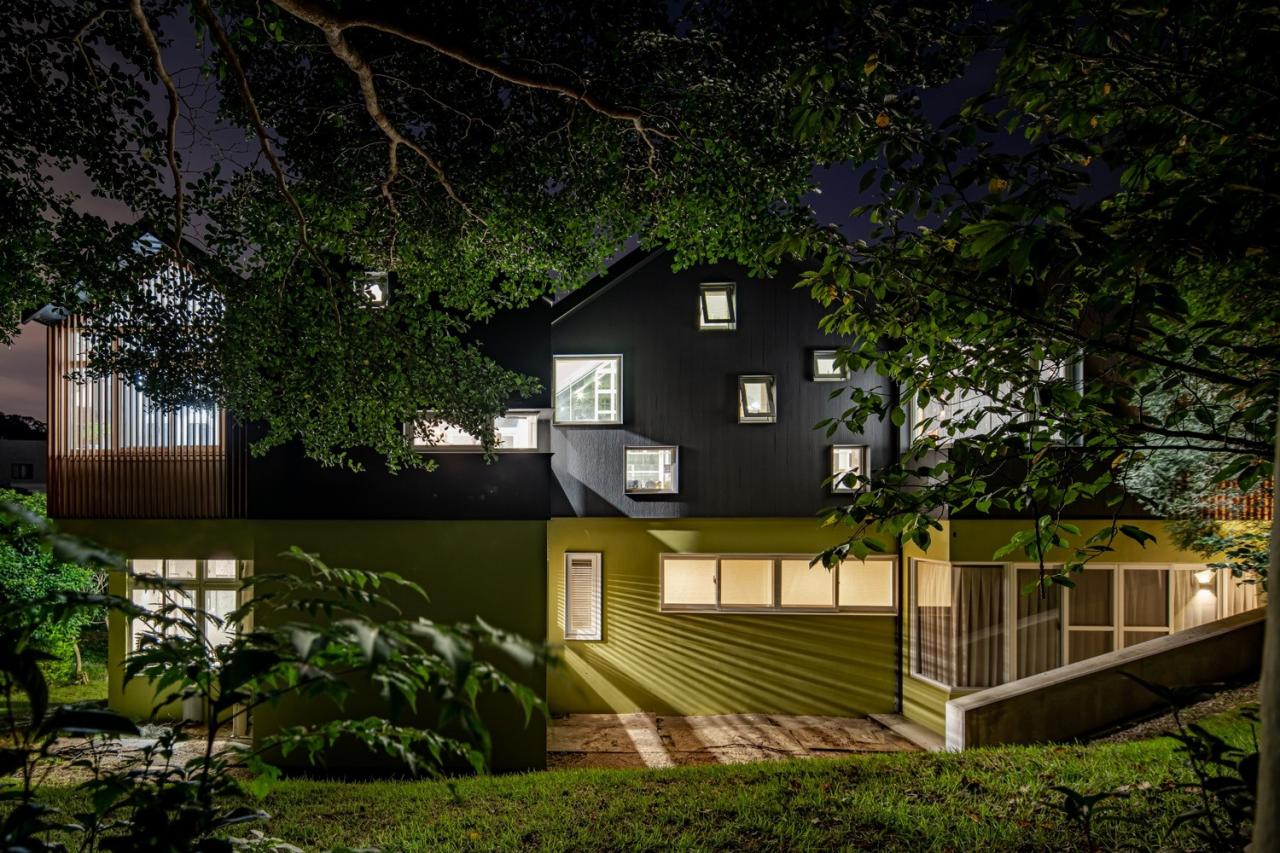 沿著碎石小径走入基地, 会心一笑发现长出地面的四个不同层次山形屋顶,地下室顺应地形嵌入自然凹地中。