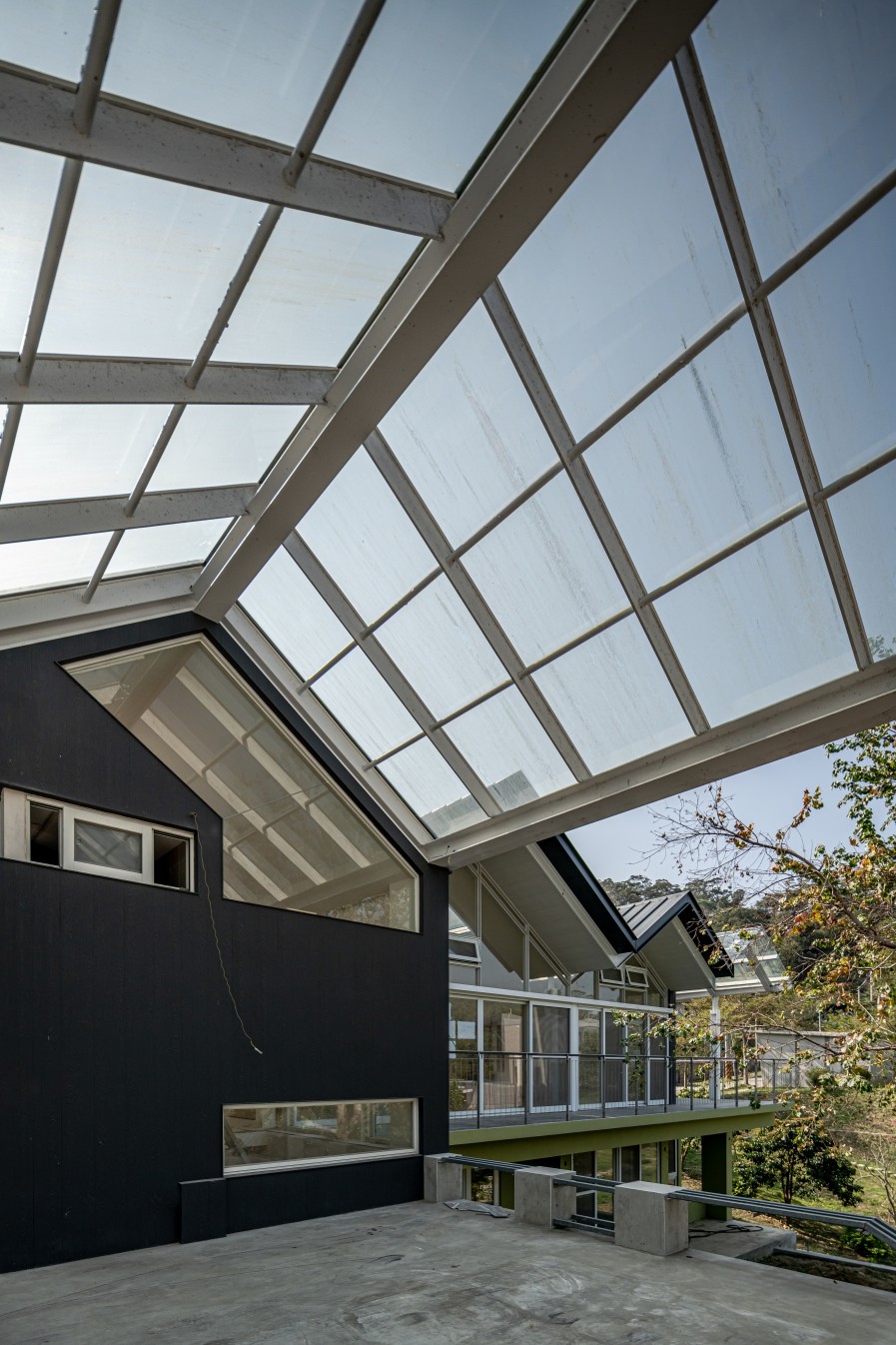 山簷屋顶下空间,是一进一进的序列,同时也是开放、 连续、流动的生活场域。生活与视线朝著屋脊方向延伸至前方自然山峦,任何一个角落都能感知生活与自然。