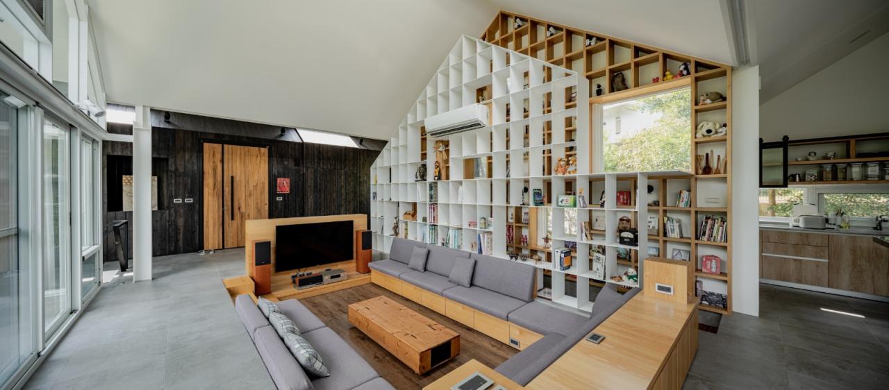 客厅藉由山形书柜往上延伸,是视觉,也是身体的感受!