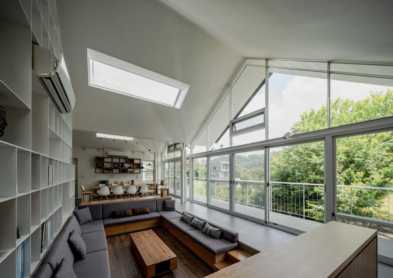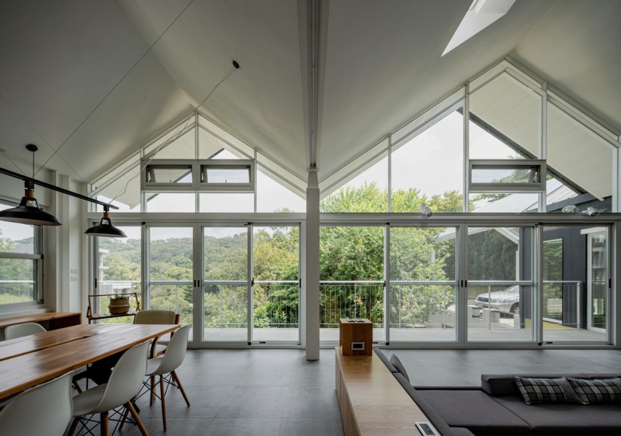 坐入下凹式座位,让视线与生活空 间顺著地板与大出簷延伸至窗外的远山群,置身于不同季节变化的山景生活中。