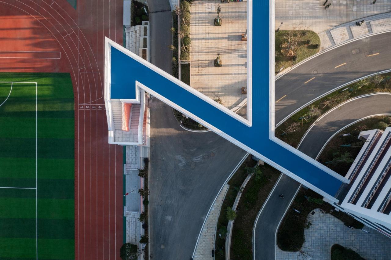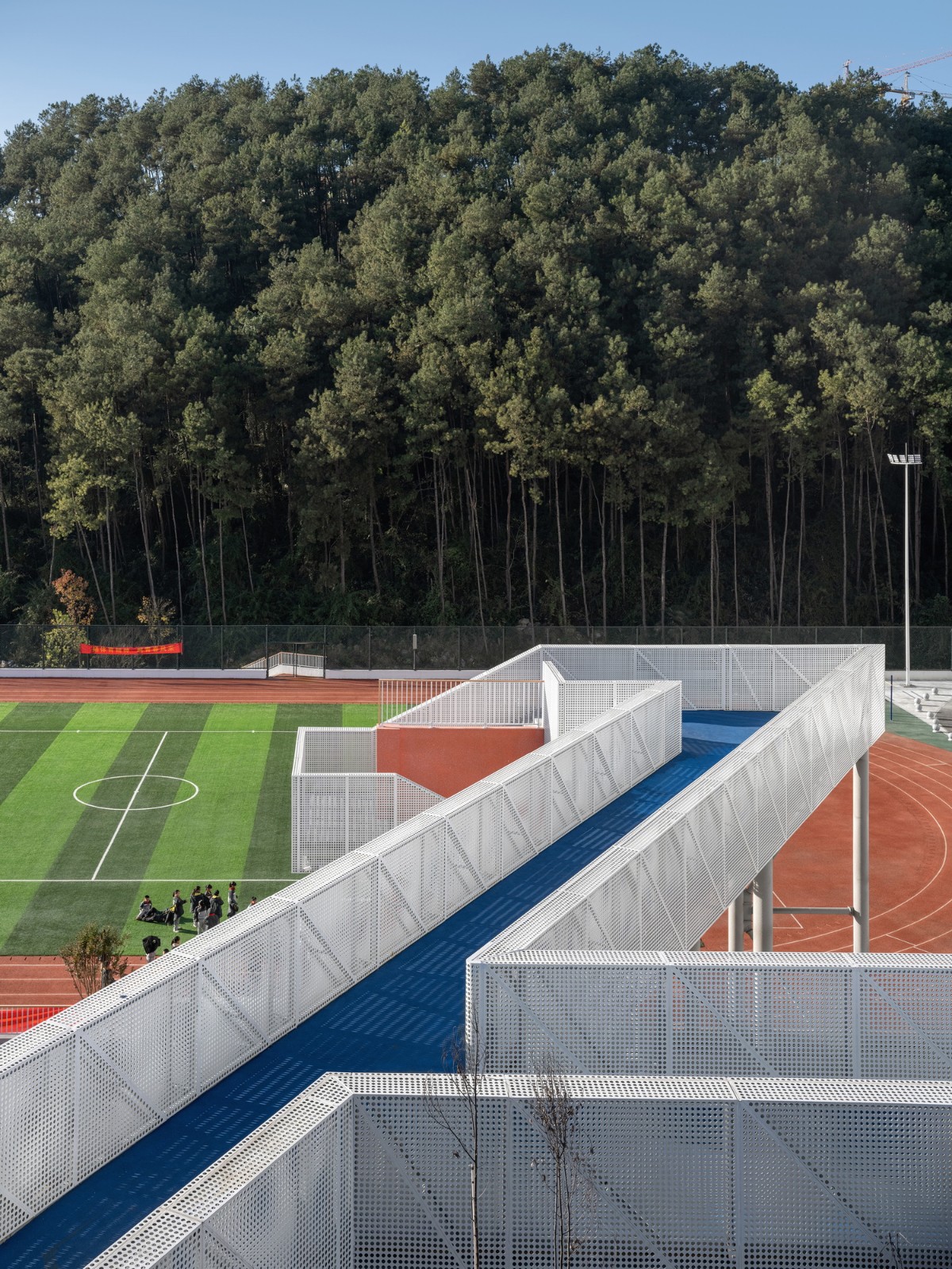 层间伸出的架空连廊,是紧凑的教学时段联结教学、运动和生活空间的高效路径;也是学有余暇,间或放学路上独自感悟的去处。建筑主体上的大尺度开洞和架空楼梯,是“这边”的书声和“那边”的树语混响交融的所在。垂直扭转的屋面,是孩子们户外写生课程的教学场地,也是雾霭之上,携手寄望山外世界的“远方”。