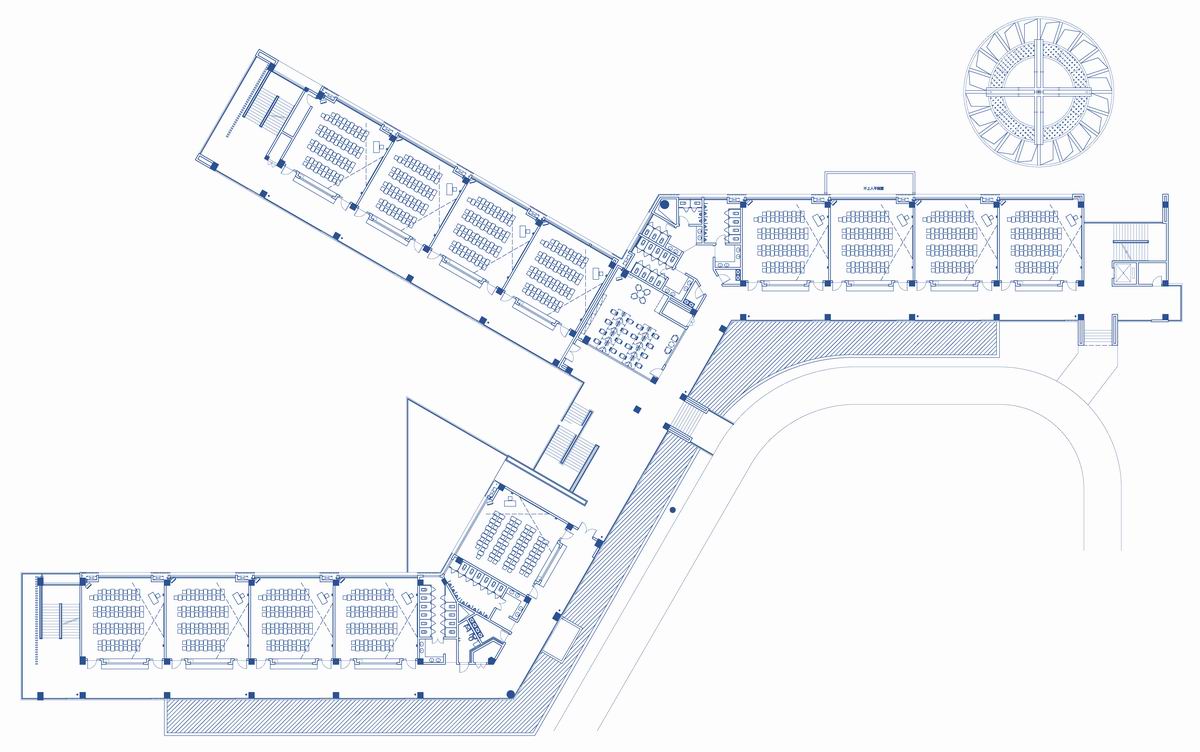 为了消解线性体量内部较长的流线带来的使用和体验问题,也为了进一步优化建筑与西侧山体环境的对话关系,每组教学体量又朝向西侧山体,以垂直于等高线的方向生出几组衍生的“枝杈”。
