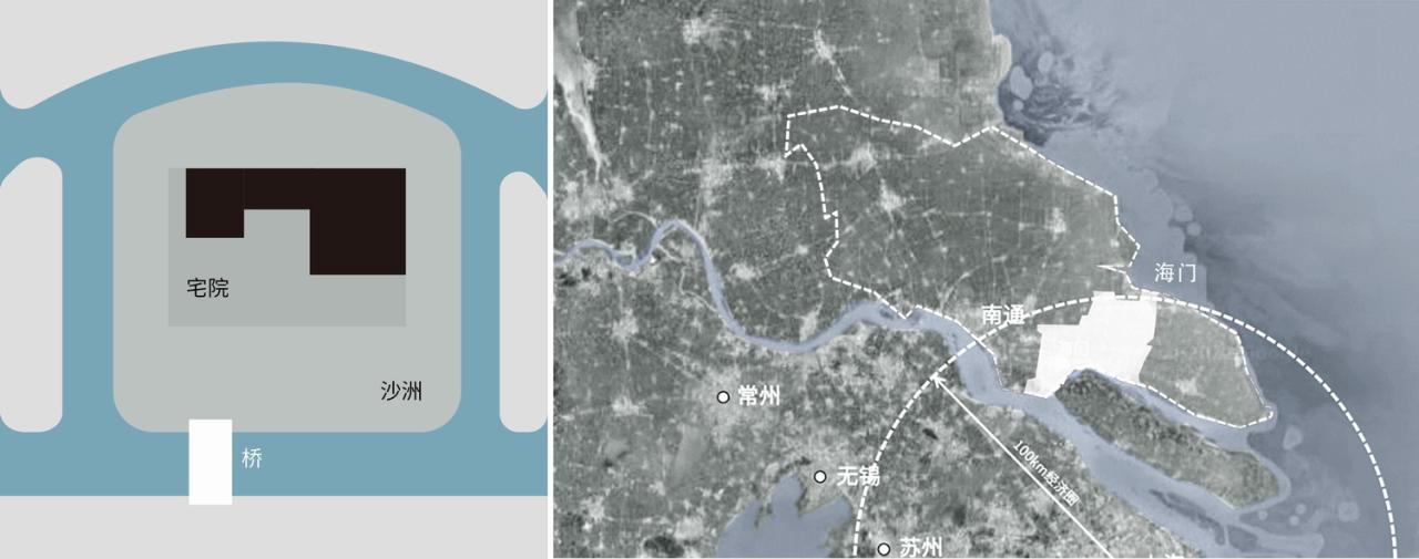 謇里小镇展览馆依水而建,借鉴长江入海口北岸崇启海地区(崇明、海门、启东)特色民居原型“四汀宅沟”:崇启海地区位于长江入海口,地势低洼、积沙成陆,劳动人民从宅地周边挖沟取土,筑高基地,形成环宅沟渠形态;宅沟常设于南侧,若以四周环绕,则被称为“四汀宅沟”。