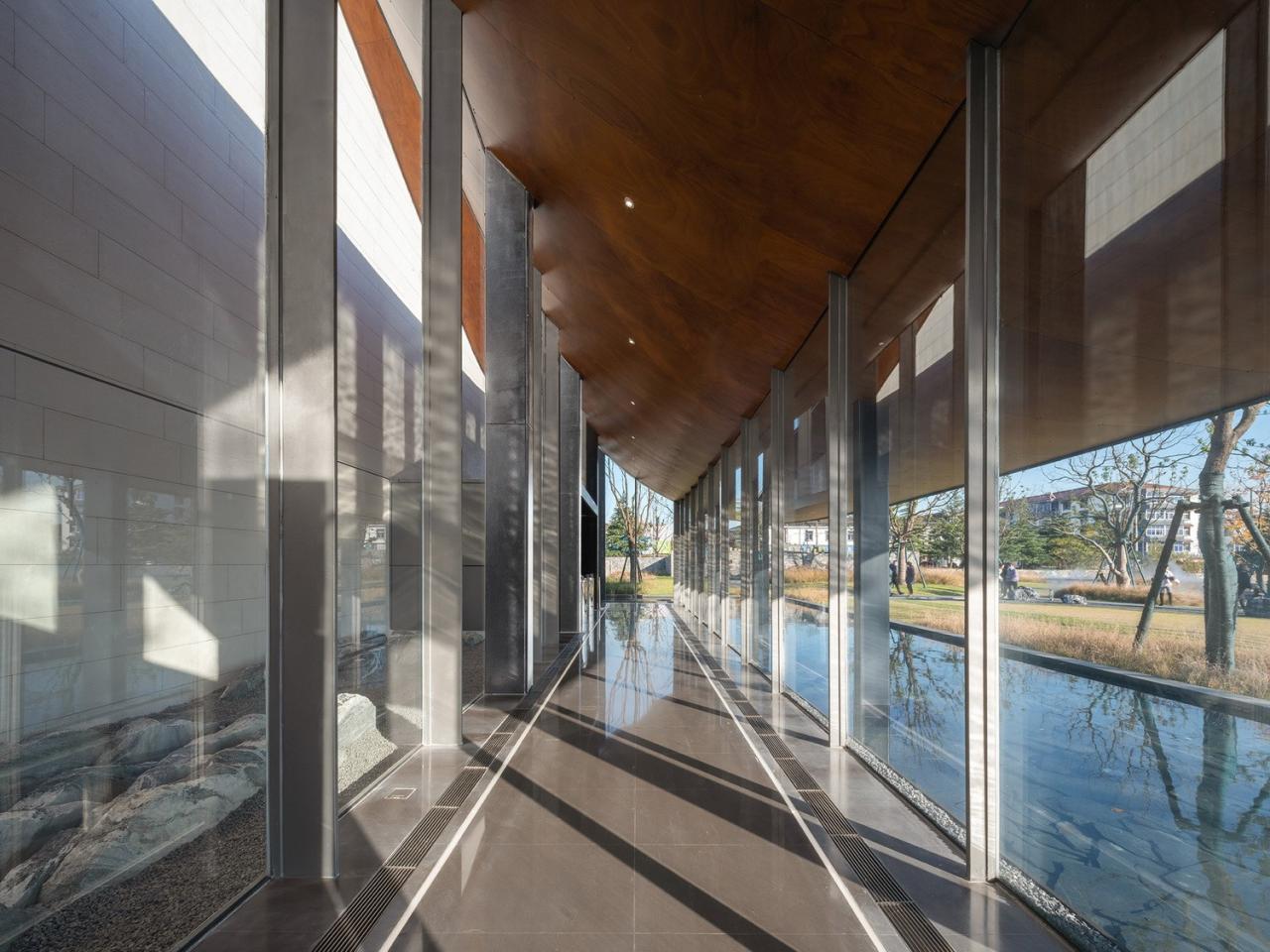 展馆整体为钢结构,门厅和序厅内柱体消隐于幕墙的竖挺中,展厅内钢柱与墙体结合巧妙,内部空间最终以无柱的形式呈现。建筑师在核心功能空间的交汇处置入窄院,将阳光、园景充分引入内部。玻璃与墙体虚实相间,使建筑内外交融,光影纯净而变化丰富。