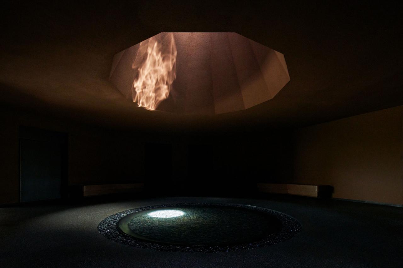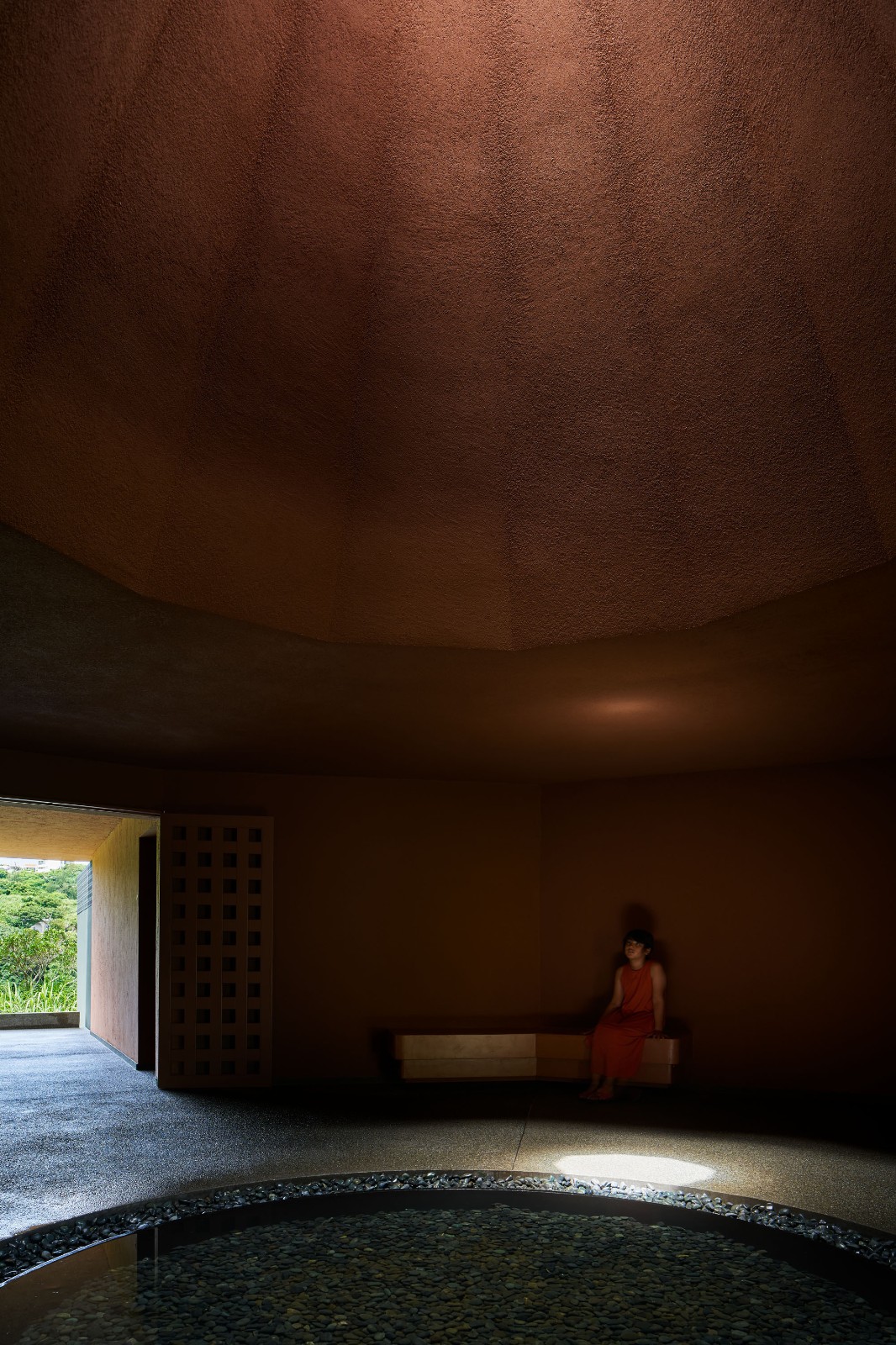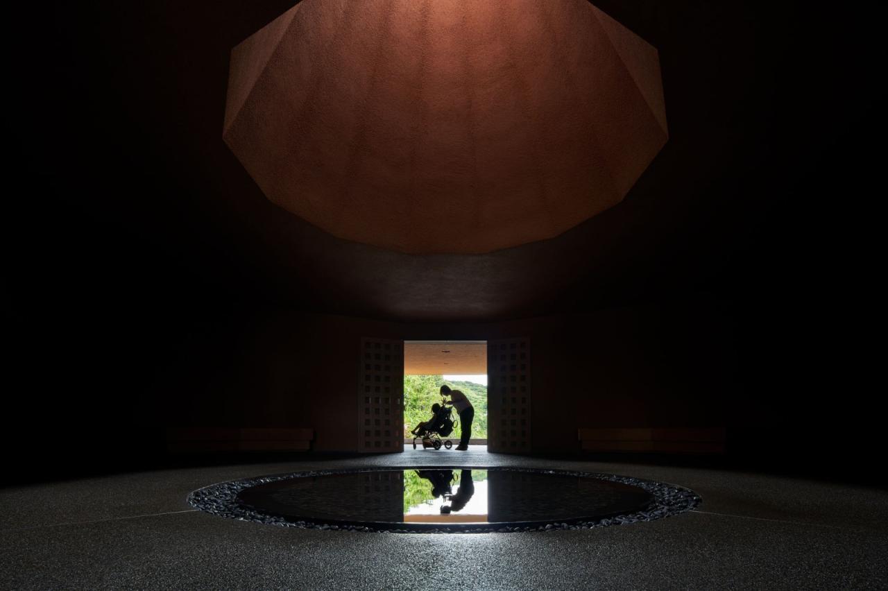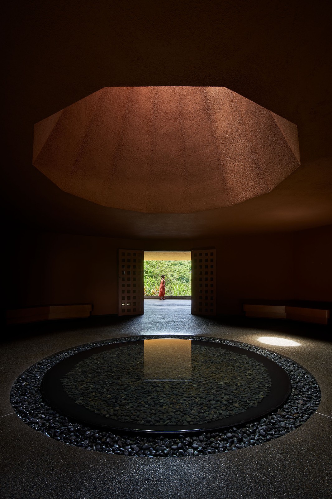 雨水和海风从无玻璃的天窗进入室内,太阳和云朵间共同产生的照明变幻也时刻在这个内省空间中上演。每当坐在宁静大厅墙壁边的长椅上,光线就会透过天窗洒在水盆中,并在天花上形成涟漪,如火焰般颤动。建筑师称其为“点燃心中的火焰”,并将其视作对家庭的鼓励。