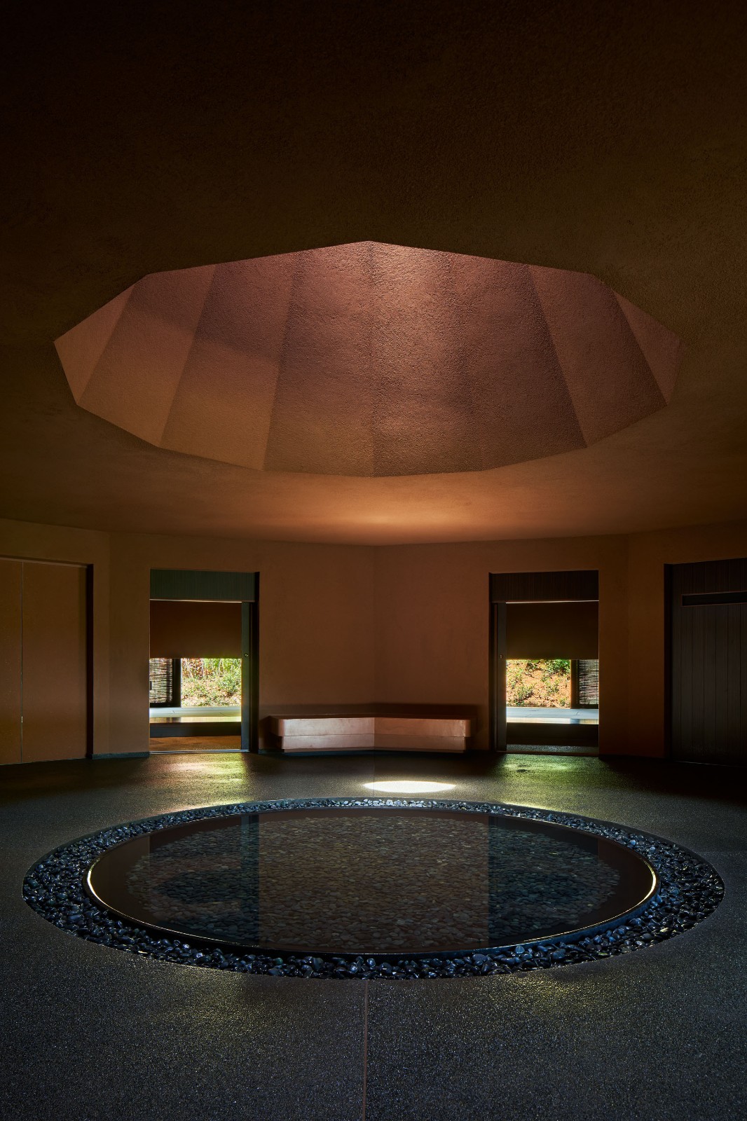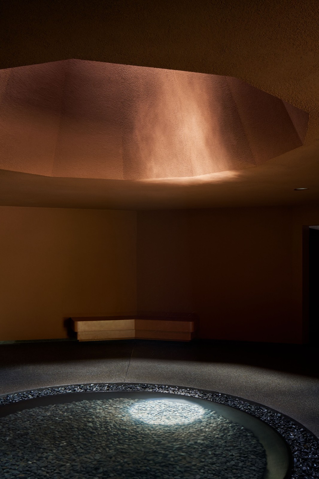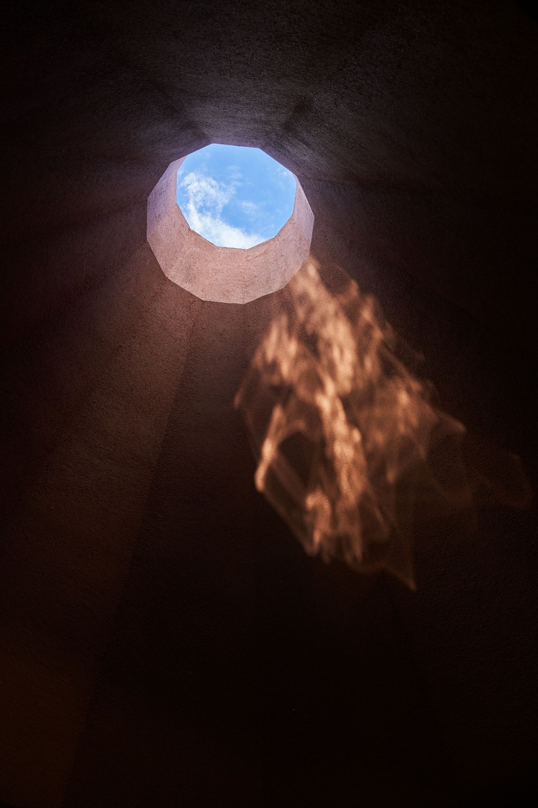 雨水和海风从无玻璃的天窗进入室内,太阳和云朵间共同产生的照明变幻也时刻在这个内省空间中上演。每当坐在宁静大厅墙壁边的长椅上,光线就会透过天窗洒在水盆中,并在天花上形成涟漪,如火焰般颤动。建筑师称其为“点燃心中的火焰”,并将其视作对家庭的鼓励。