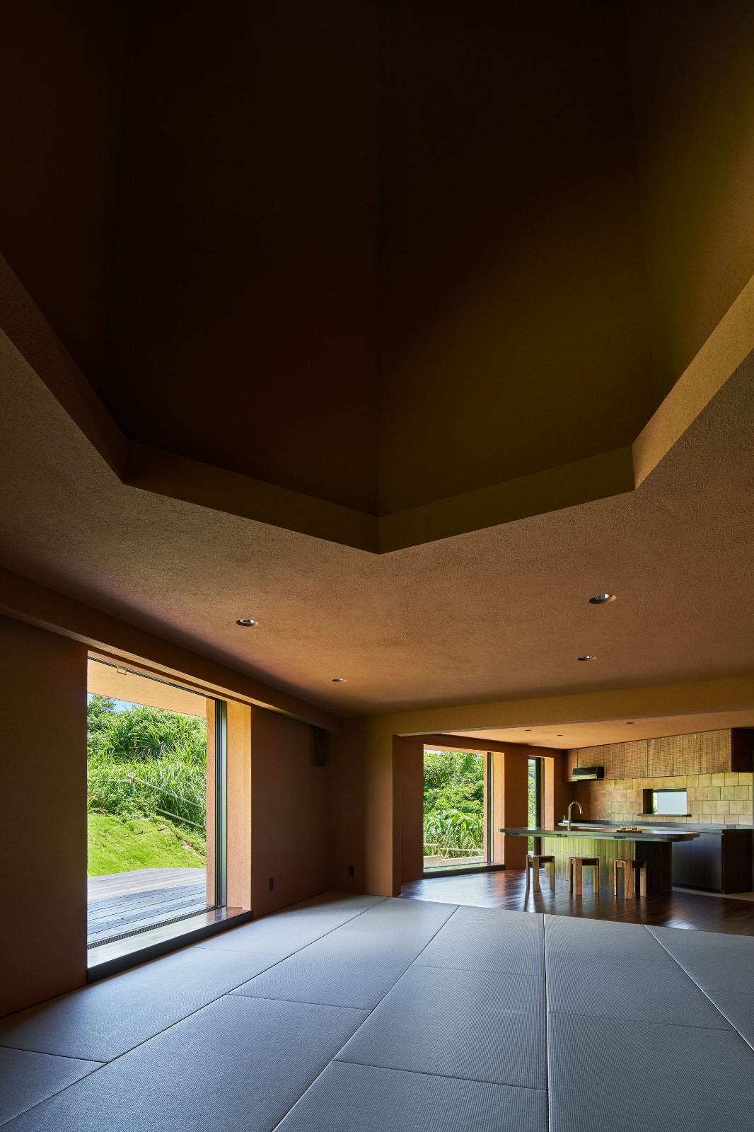 建筑师研究了日本气象厅的风向频率统计,并同时采用了现场调查的手法,根据下午从悬崖下海洋和河流吹来的风向以及晚上从山下吹来的风向,最终确定了项目的水庭院位置。由于其与庭院外围的温度差异,从水庭院中心拂过的清风总是清爽的。