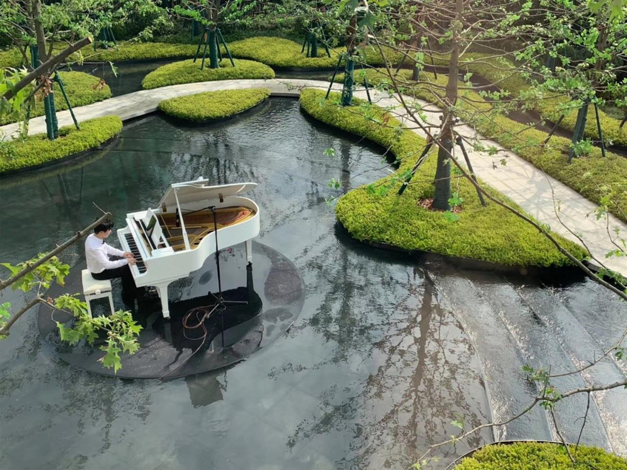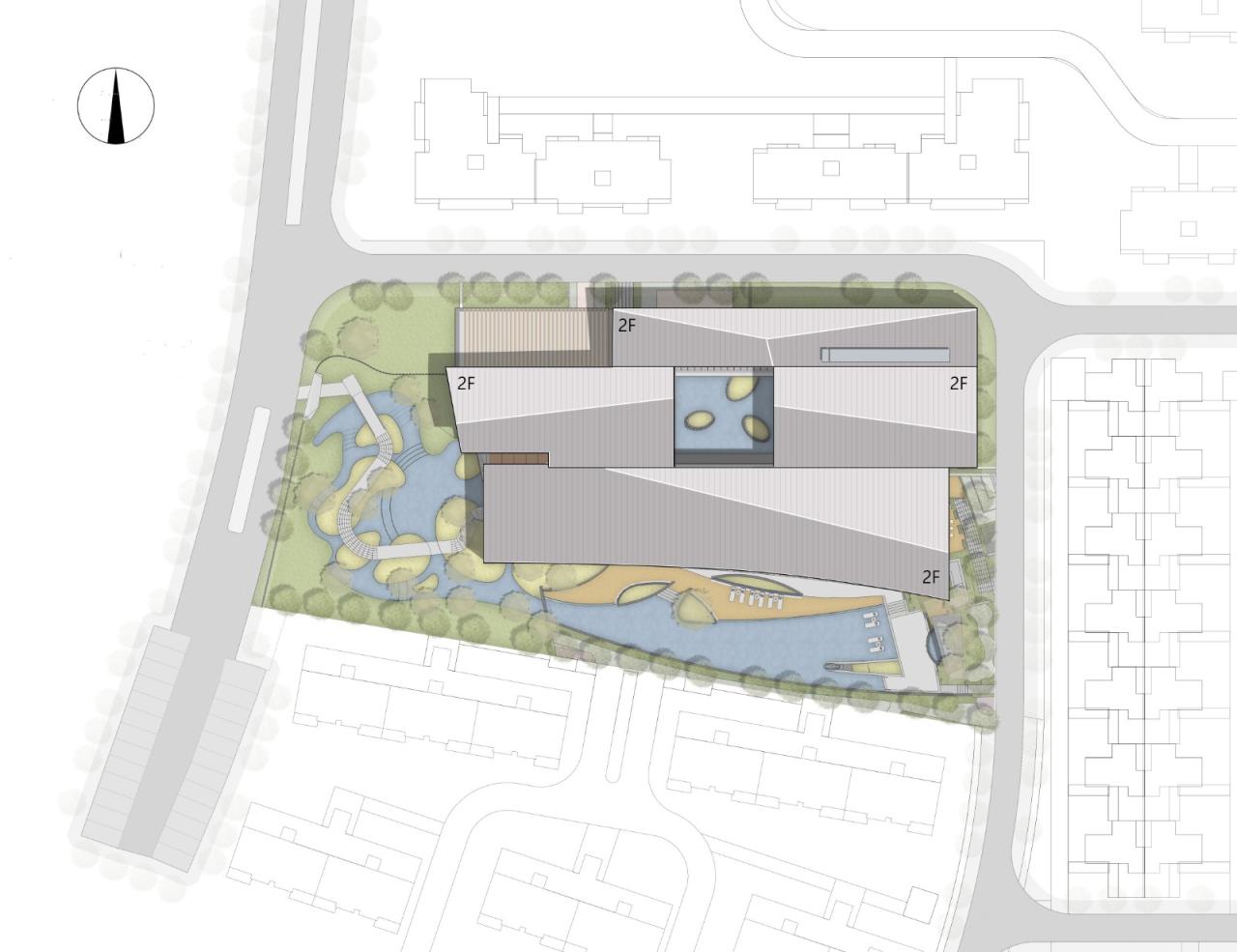 到达建筑主入口之前,参观者需要穿过曲折蜿蜒的小径,四周围绕着水面与树木,仿佛来到了一片世外桃源。
