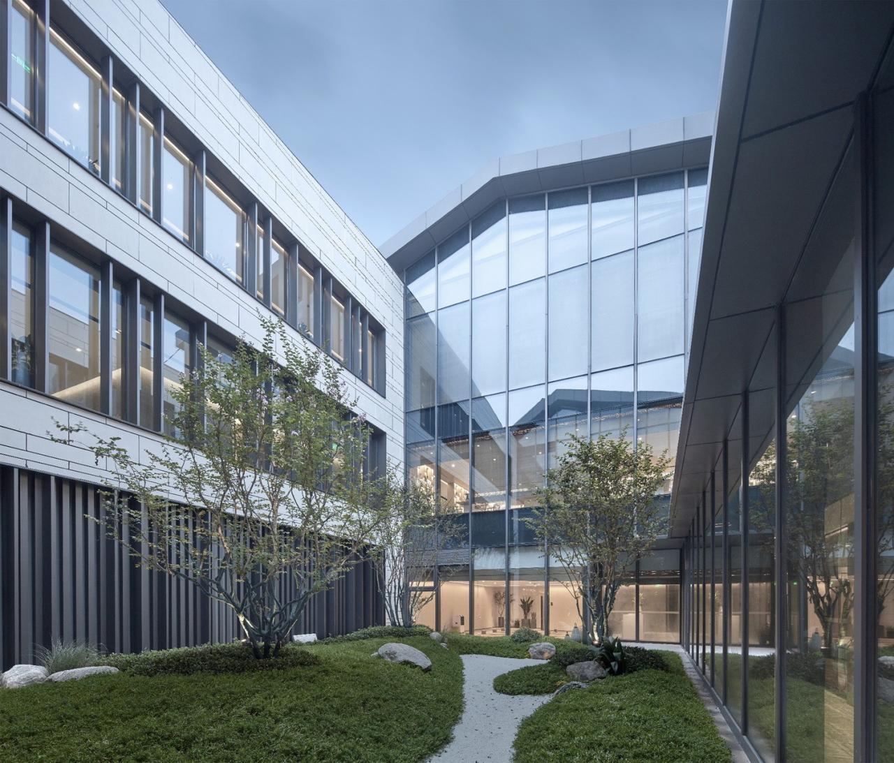 屋顶通过灰色的混凝土瓦向传统的江南民居呼应,坡屋顶与内庭院及南侧的大面积落地玻璃结合得非常巧妙,透过现代手法可以看到对传统的呼应及致敬。