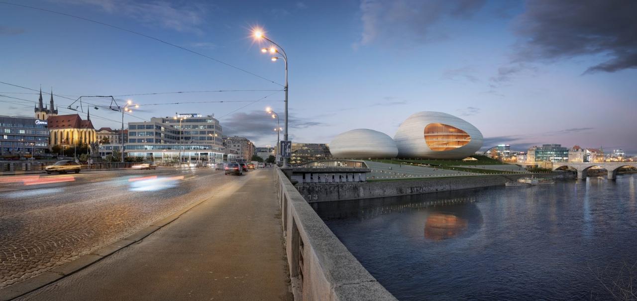 伏尔塔瓦河爱乐音乐厅的最终设计提案展示了场地的潜力,并将成为新鼓-扎托里区(the new Bubny- Zátory district)的核心。由 Barozzi Veiga 事务所和Atelier M1事务所联合设计的第二名设计方案则提议打造一个更为紧凑且更具雕塑感的体块。由Bevk Perović Arhitekti设计的三等奖提案则通过层叠的玻璃幕墙模糊了建筑的外轮廓。而受邀参与竞赛的 CHYBIK + KRISTOF (CHK) 事务所和 Mecanoo 建筑事务所则将建筑用丝带包裹了起来,从而分离了各个音乐厅体量,继而在核心构筑了一个露天的圆形剧场。