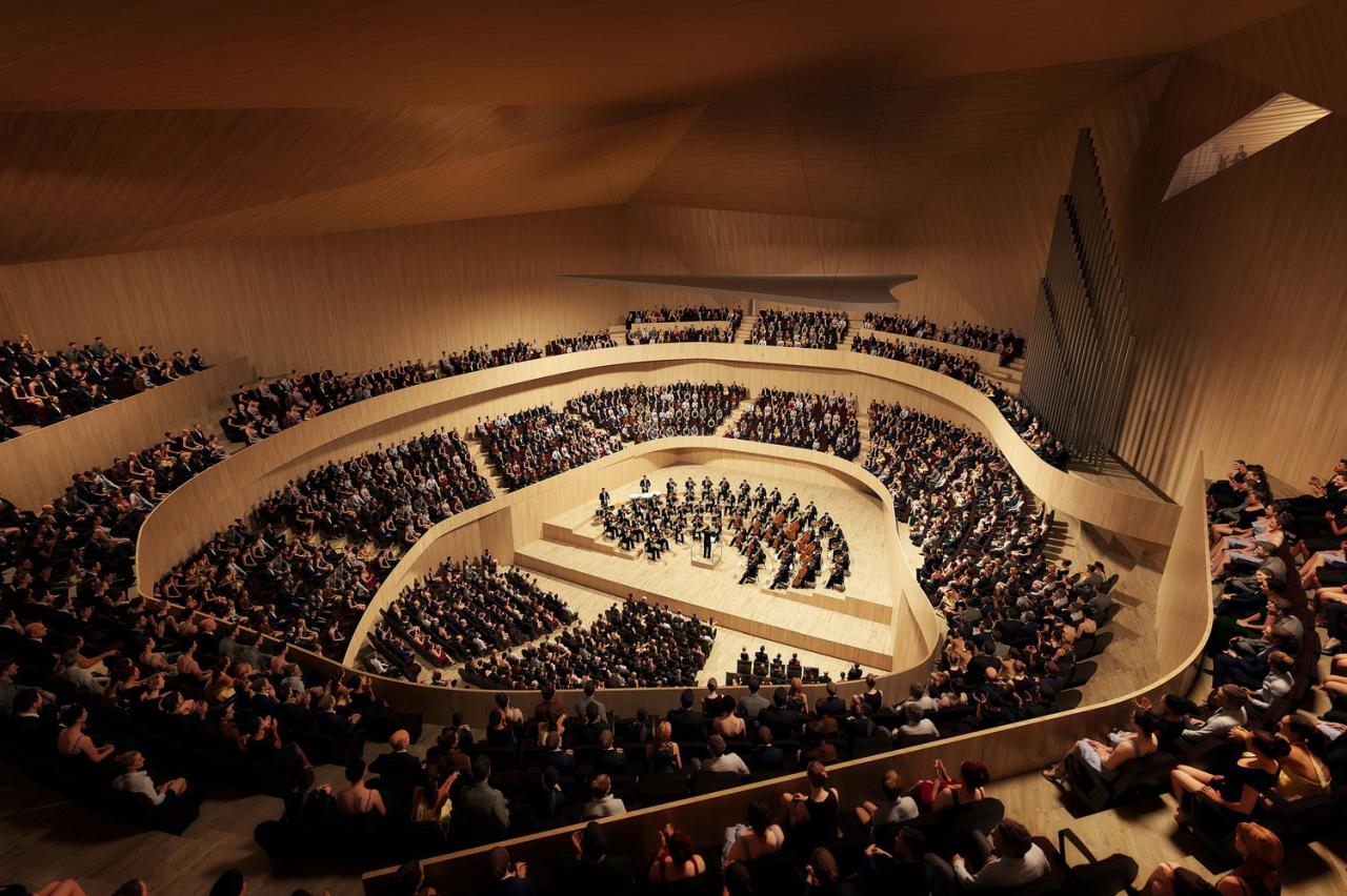 伏尔塔瓦爱乐音乐厅最终中标方案将共打造三个音乐厅:伏尔塔瓦厅、主音乐厅场馆以及有着更多功能的布拉格及霍勒索维采厅。布拉格厅中的座位将像松果瓣一样由中心向外放射排列,从而为厅内的每一位观众优化看向舞台的视野。此外,温暖的木材内饰则将让人们体验到亲密感,同时也让每个空间都可以拥有更加平衡的声学特质。