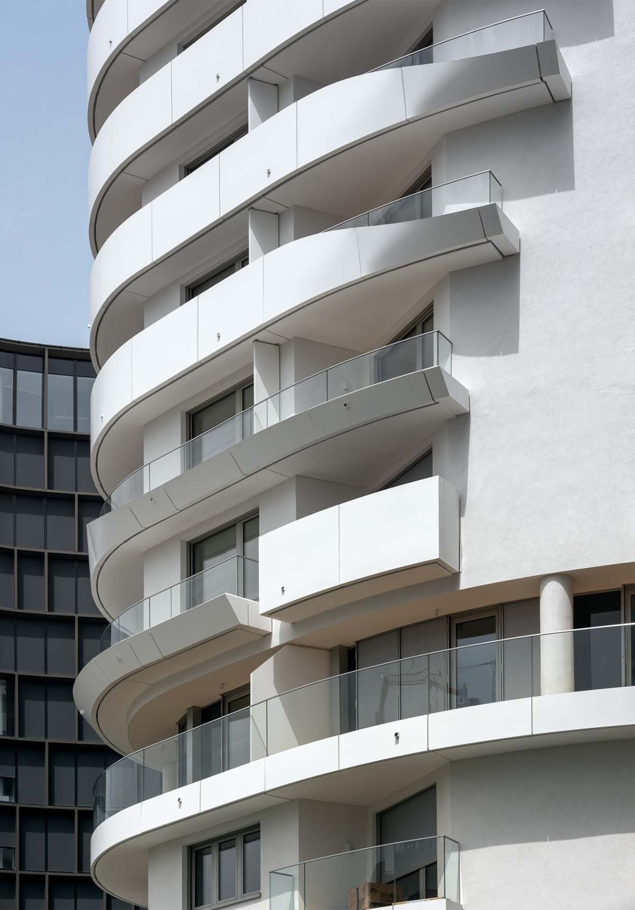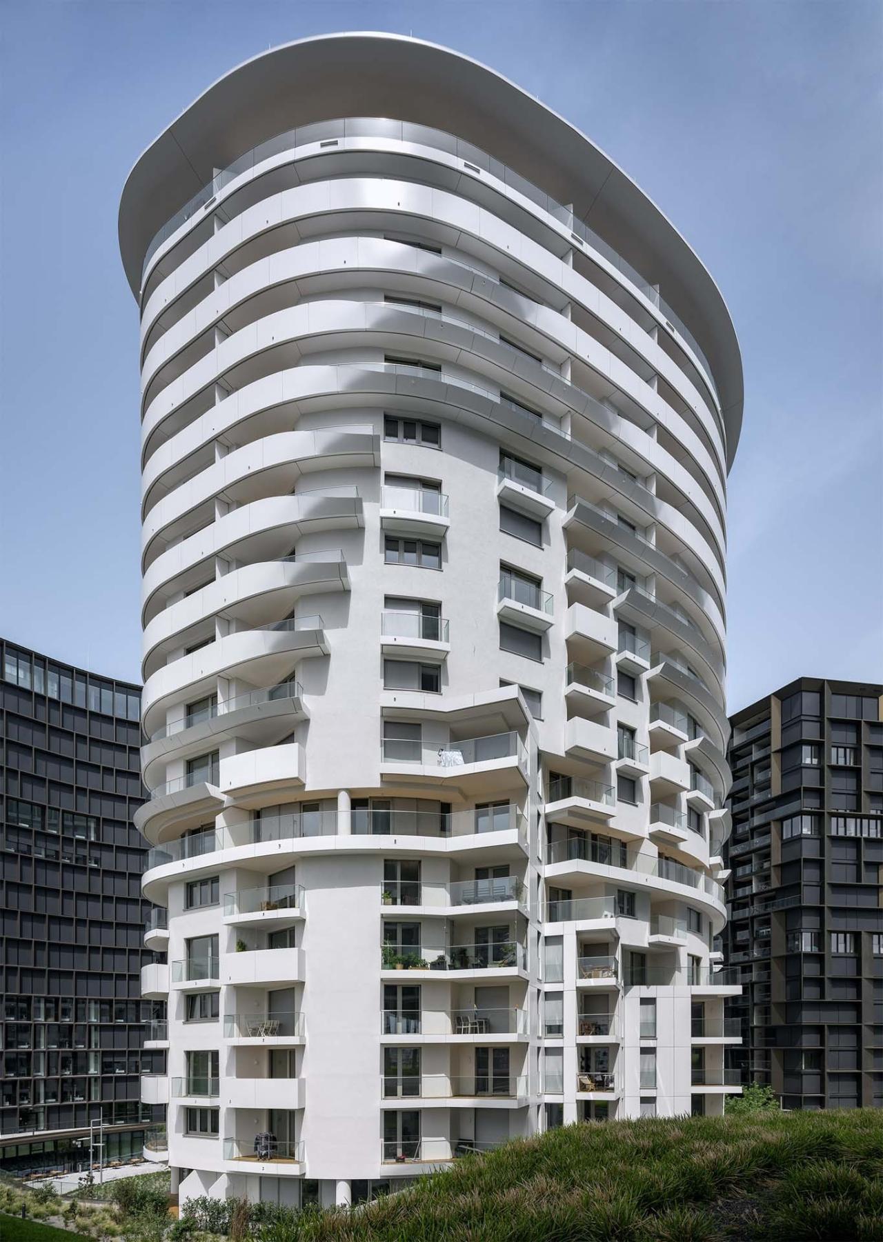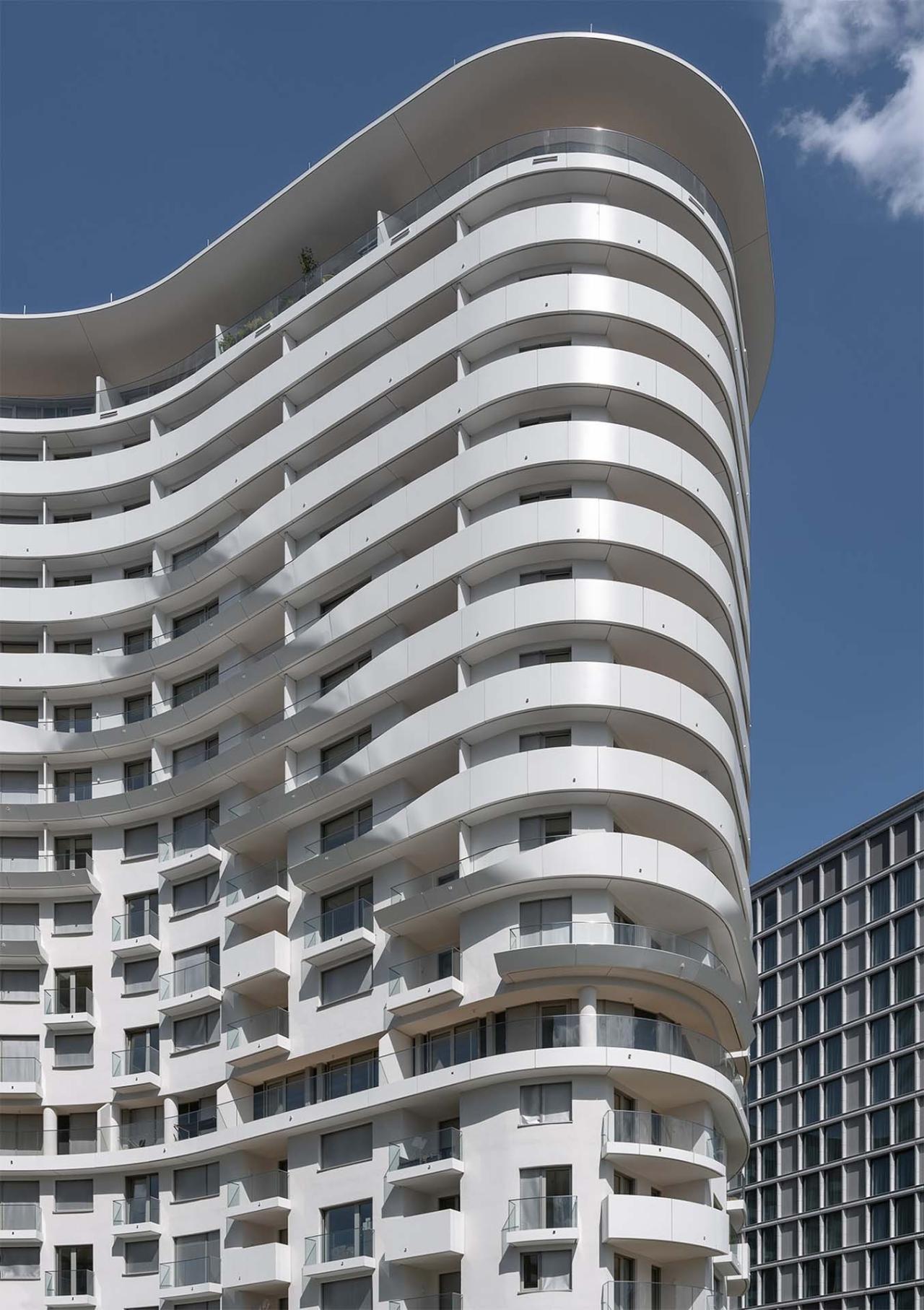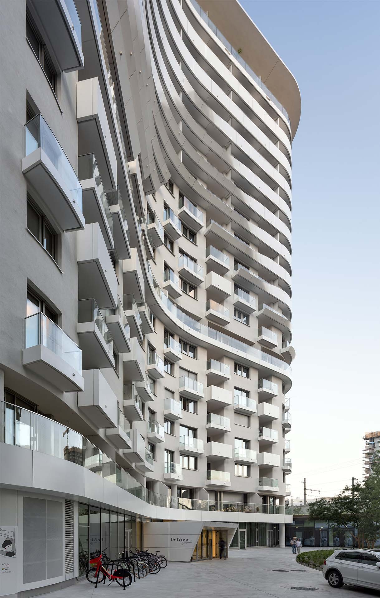 贝尔维尤塔共有18层,其建筑总体形态及立面可以分为3个逐层后退的玻璃区域。项目包含了234套两居室以及15套三居室,为特别适合单身及年轻情侣居住的租赁公寓。