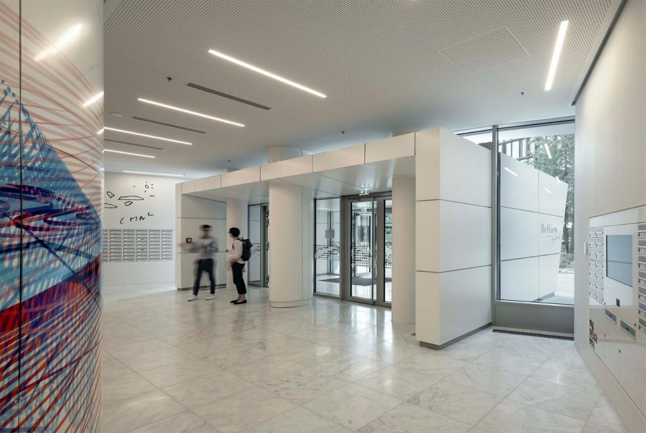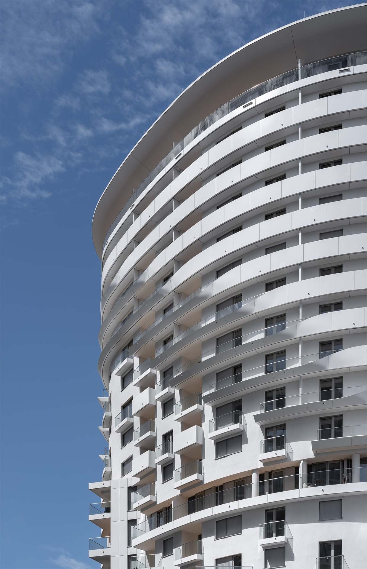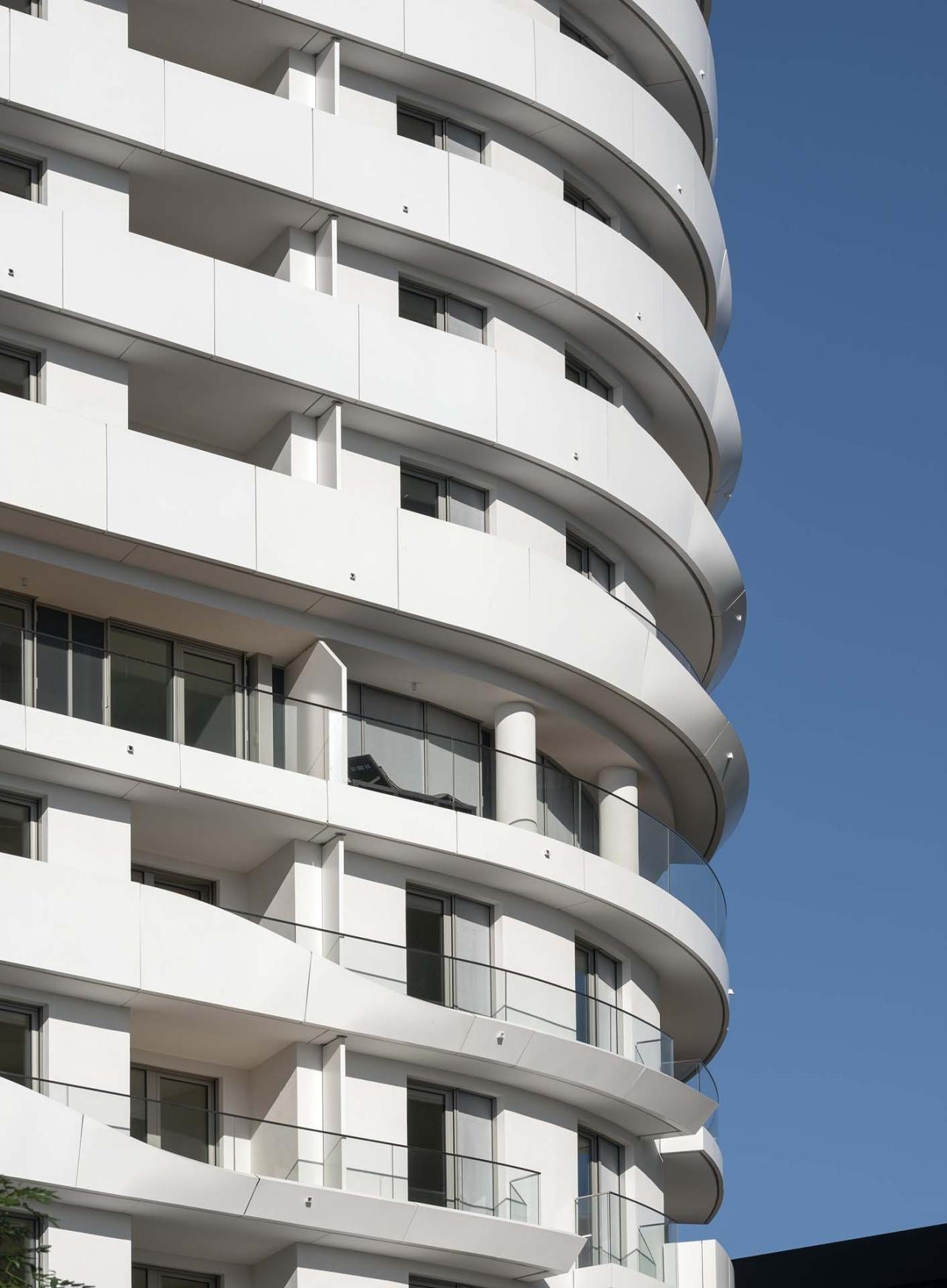 贝尔维尤塔共有18层,其建筑总体形态及立面可以分为3个逐层后退的玻璃区域。项目包含了234套两居室以及15套三居室,为特别适合单身及年轻情侣居住的租赁公寓。