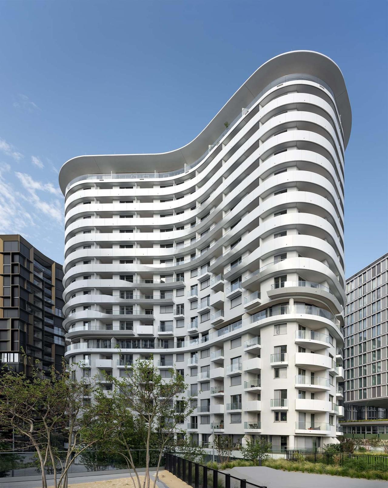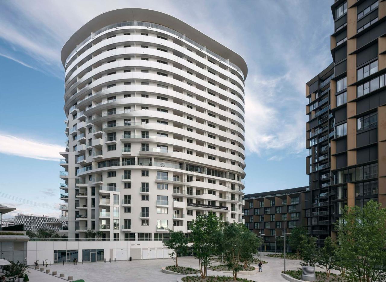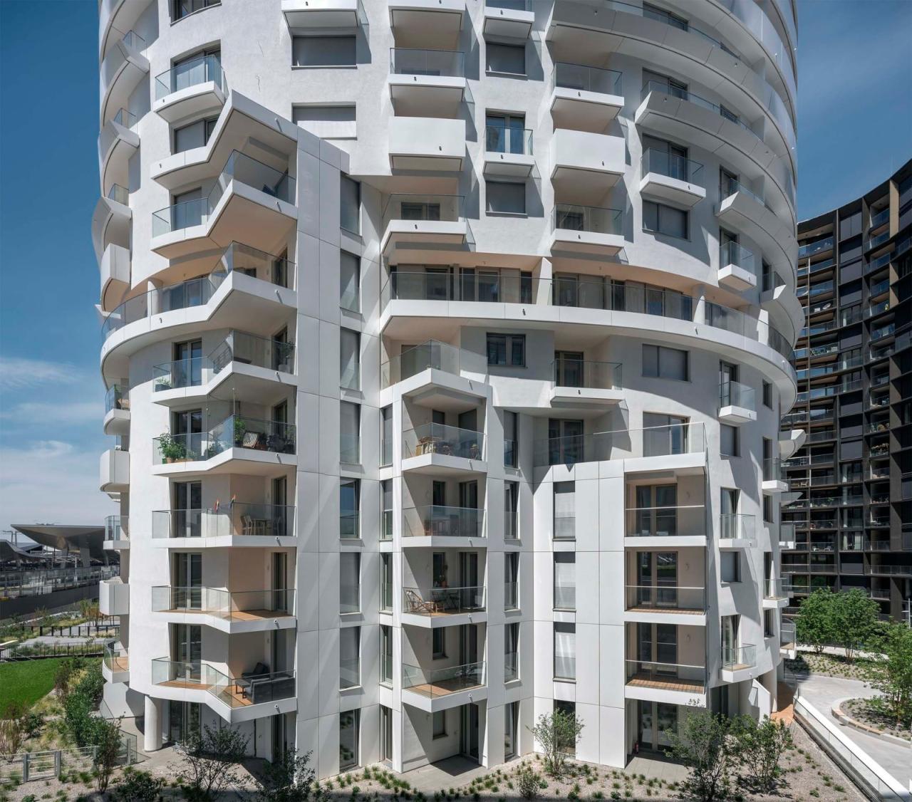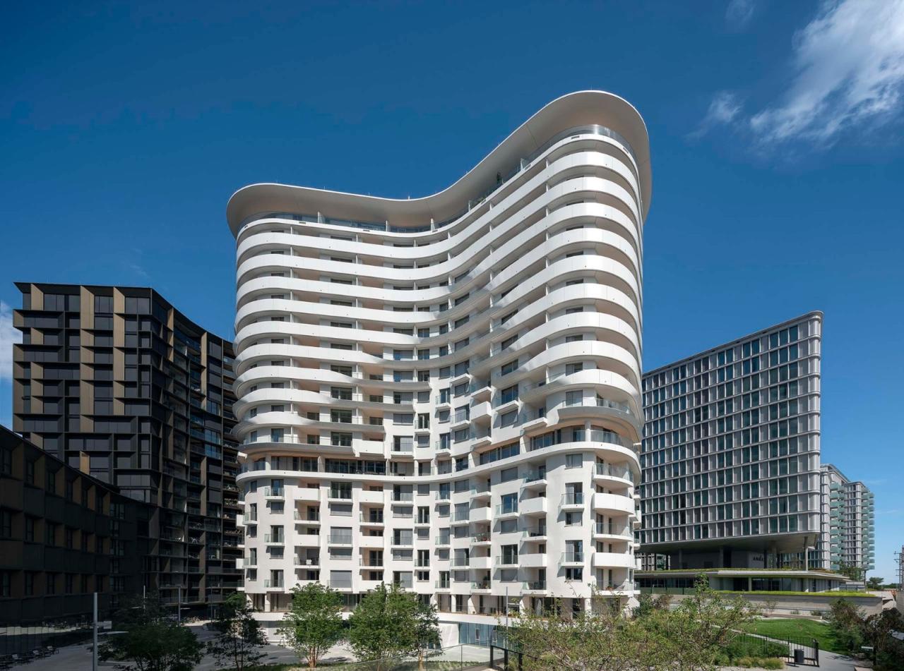 贝尔维尤塔共有18层,其建筑总体形态及立面可以分为3个逐层后退的玻璃区域。项目包含了234套两居室以及15套三居室,为特别适合单身及年轻情侣居住的租赁公寓。