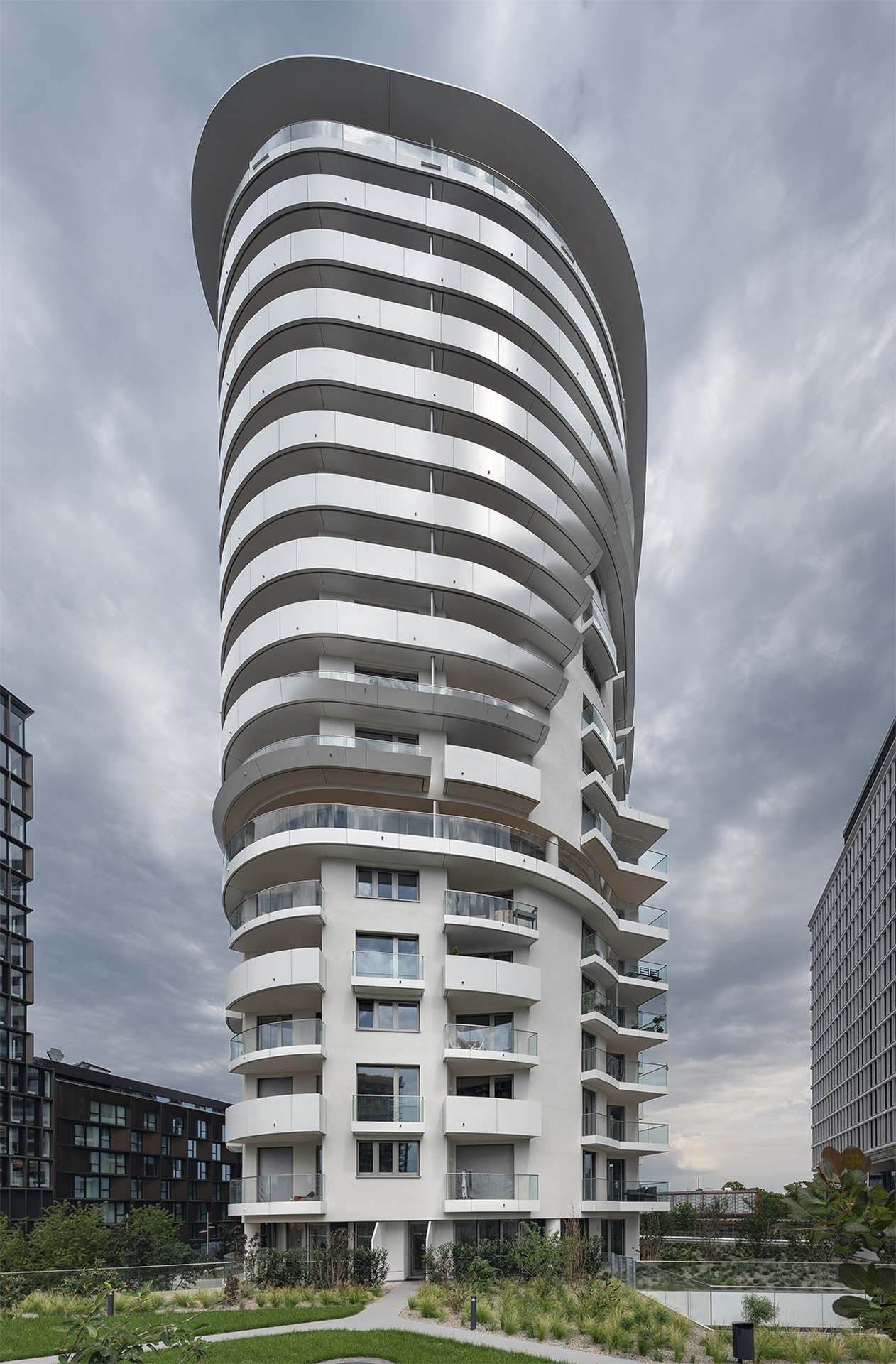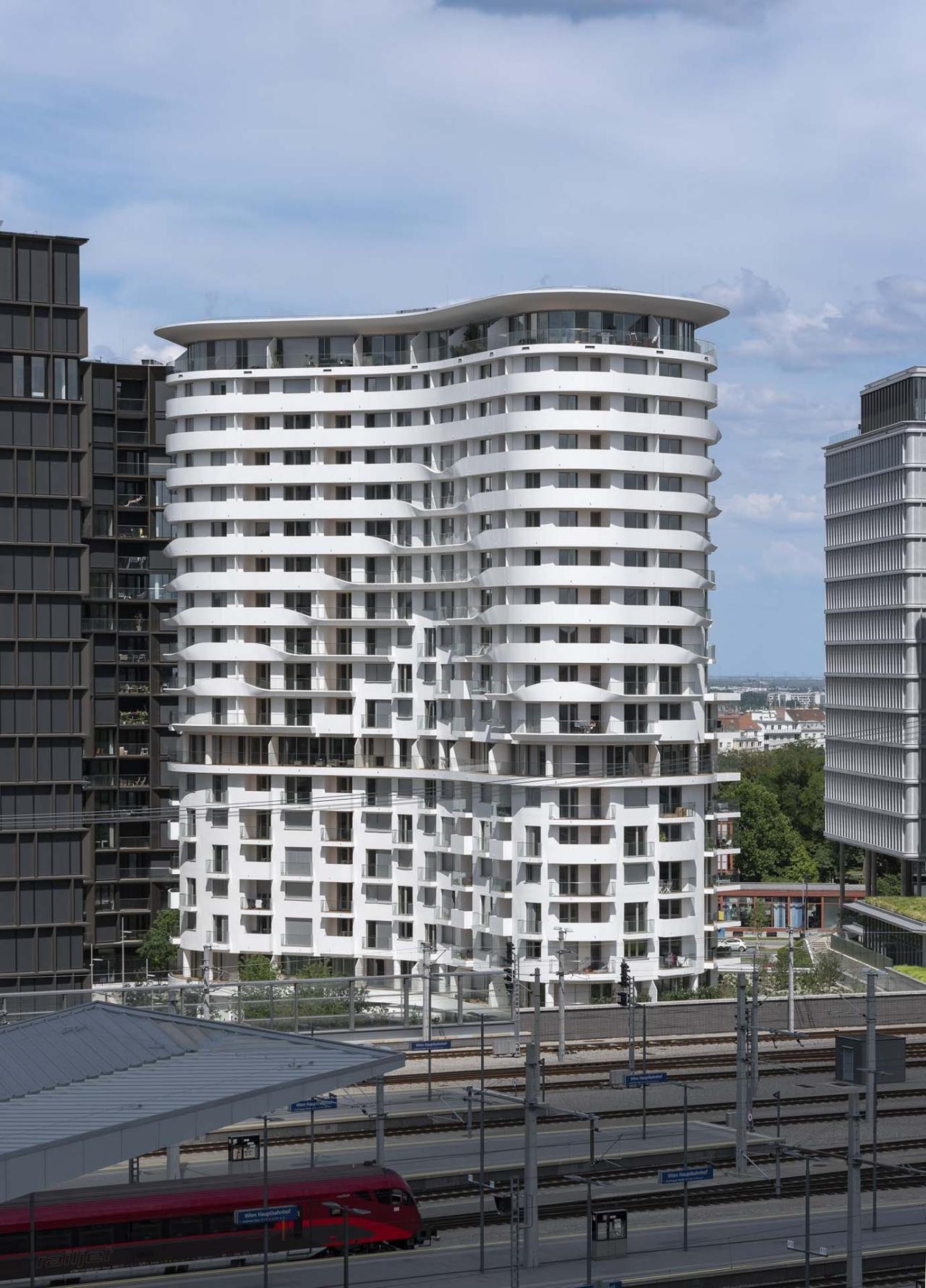 贝尔维尤塔坐落在维也纳火车总站的附近,毗邻贝尔维帝中央区(Quartier Belvedere Central)的瑞士花园(Schweizergarten)。住宅楼如同一个正在流动的巨型架构,展示着类原生细胞体的有机形态。建筑的外围护栏带由白色亚光铝板所打造,环绕着建筑边缘,并在特定区域根据风、声、光等不同的环境因素有节奏地延续、扭转、暂停,由此统一了不同立面区域的实墙、玻璃、线性元件及点状阳台等元素。
