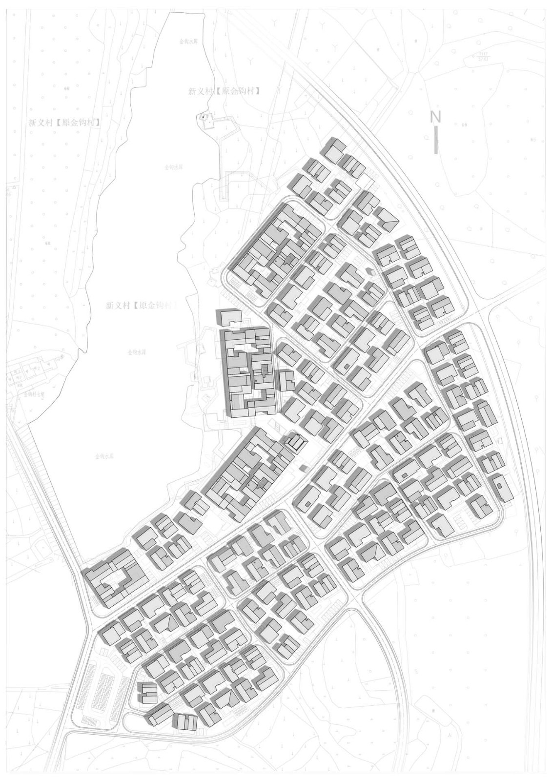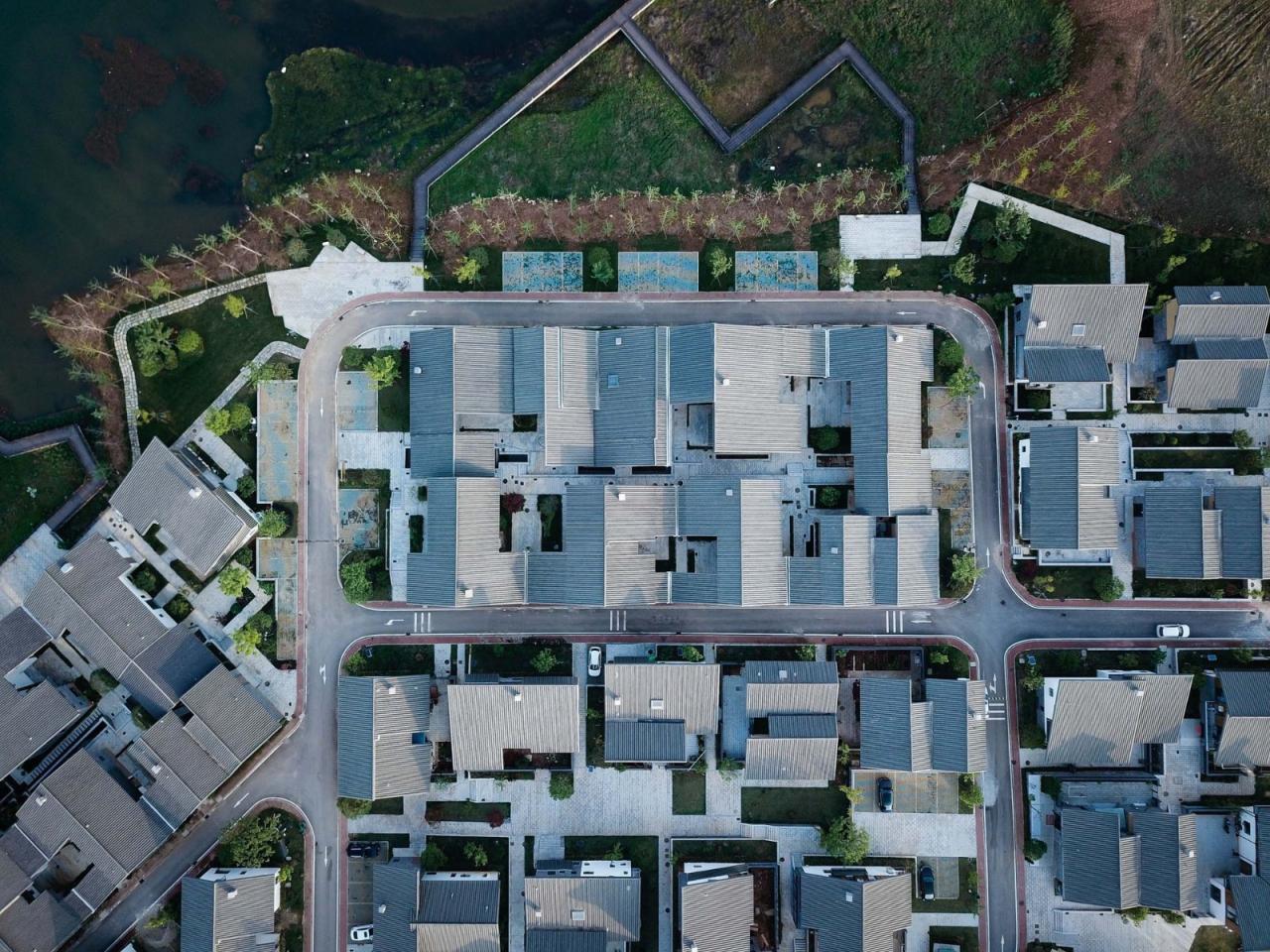 湘北大屋的重构这原本是一种家族式建筑群,建筑之间有明显的轴线关系,在每条轴线上通过天井的串联,形成“丰”字形空间递进。但无论建筑群如何扩张,屋顶始终紧密连成一片。因此整个大屋呈现“下分上合,多进多排”的特点。通过“轴线——图底——分户——去礼制——归类”的分层解读,我们从“大屋”中拆解出6种建筑单体基本类型,再通过变形、筛选、组合,将其拼合成不同规模的大屋聚落,每一组大屋外围包裹机动车道,内部形成宅间人行小径。