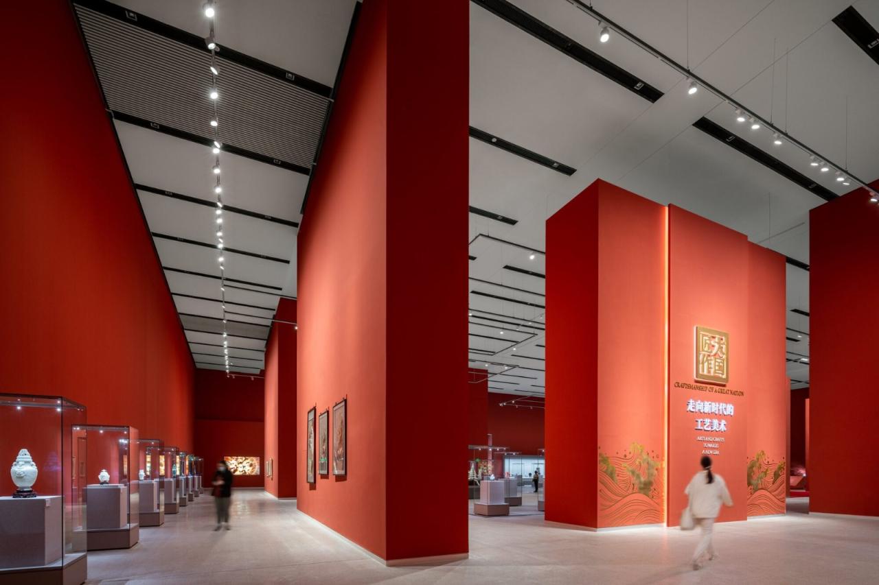 博物馆区分布在三个楼层,临时展厅设置在玻璃幕墙的平台层,常设展厅在两层高的主体建筑里。建筑结构采用大面积无柱空间,可以容纳多样化的展览方式。落地展墙单元可以灵活划分展览区,这也使得这两个主题迥异的博物馆可以在同一个屋檐下和谐共存:一方面是传统技艺等门类的非物质文化遗产展览,另一方面是琳琅满目、典雅精致的中国工艺美术展览。