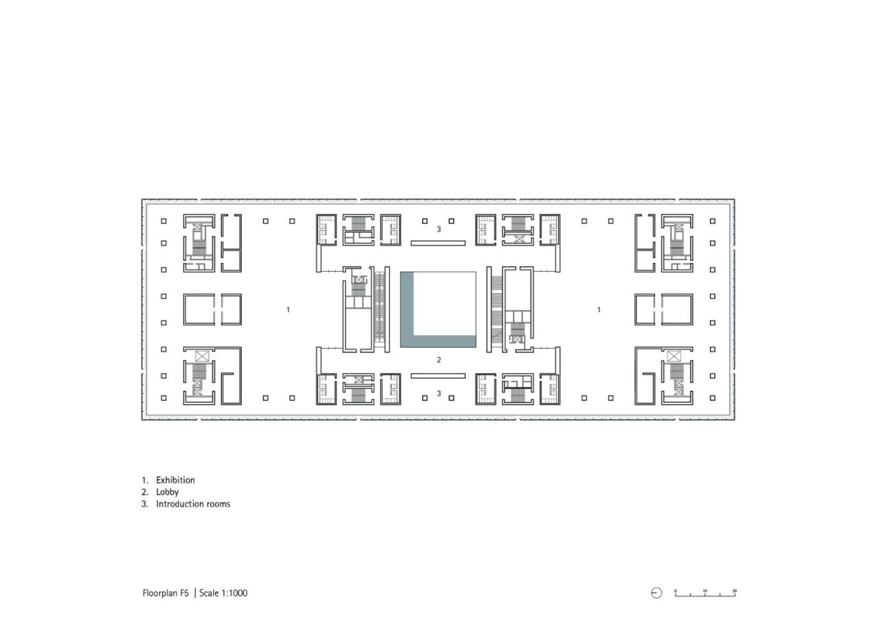 博物馆的两个入口位于建筑的中轴线上。博物馆既面向东侧的广场、也面向西边的河岸开放。两个入口通向共同的中央入口大厅。比邻大厅的是有约 400 个座位的大型多功能报告厅,以及可灵活使用的互动体验展厅。中央大厅通高的开放空间通过屋顶的正方形天窗自然采光。在前往展厅的路上,可以从环绕大厅的公共环廊获取更宽阔的视觉体验。公共环廊的墙面和吊顶的设计,从节点构造、色彩造型上都与建筑外幕墙的设计元素相呼应。环廊上六边形的背光吊顶让人联想到中国传统手工艺的编织结构,为走廊带来静谧的空间效果。
