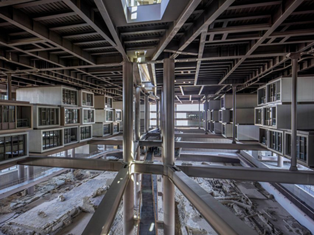 一个科学专家委员会能够确定仍有待挖掘的文物的位置。这座建筑当时被设计成适合这些挖掘地点以及已经出土的宝藏。现场共嵌入了66根柱子,以支撑悬停在地面上的巨大框架。