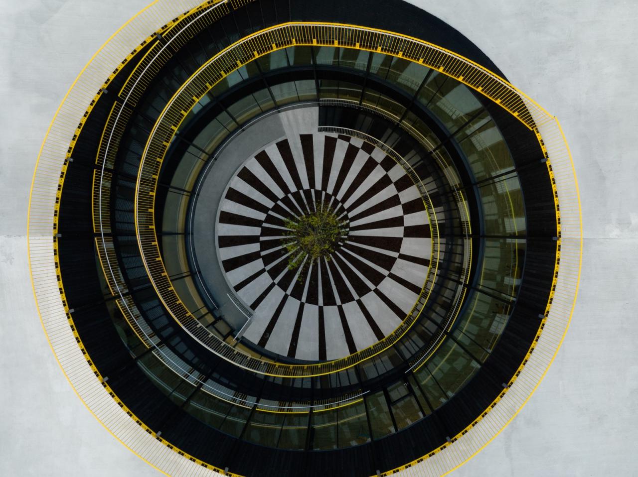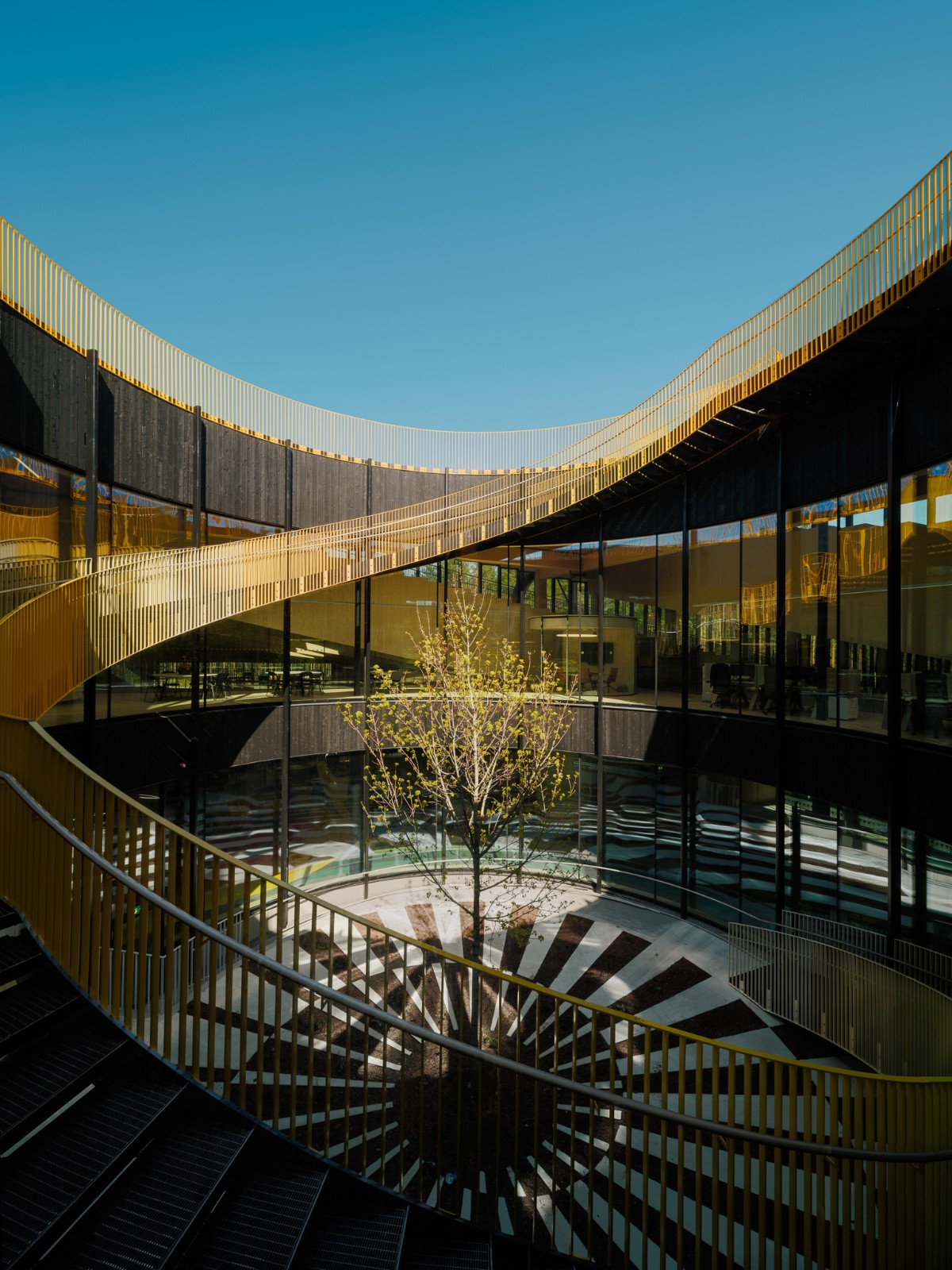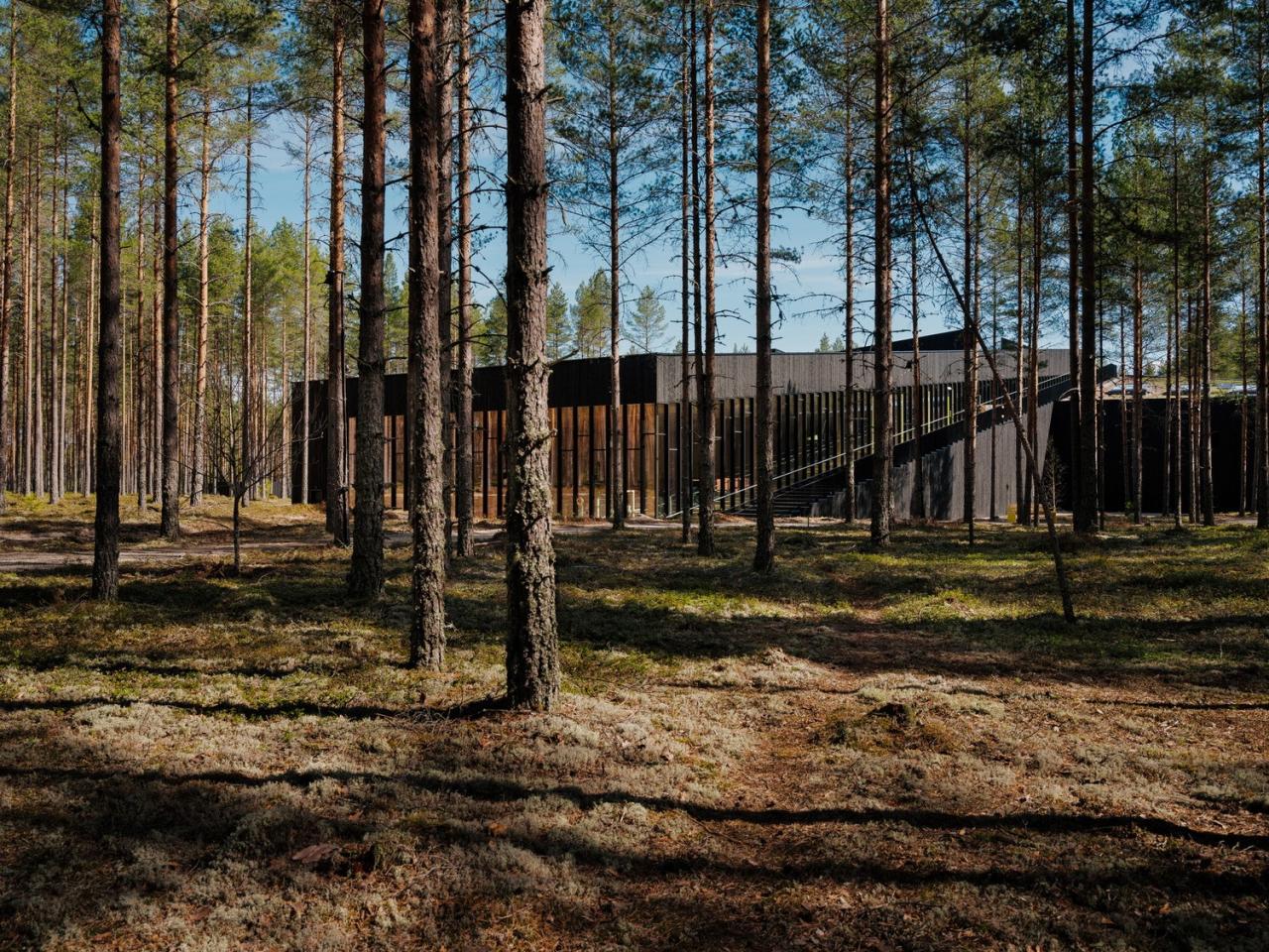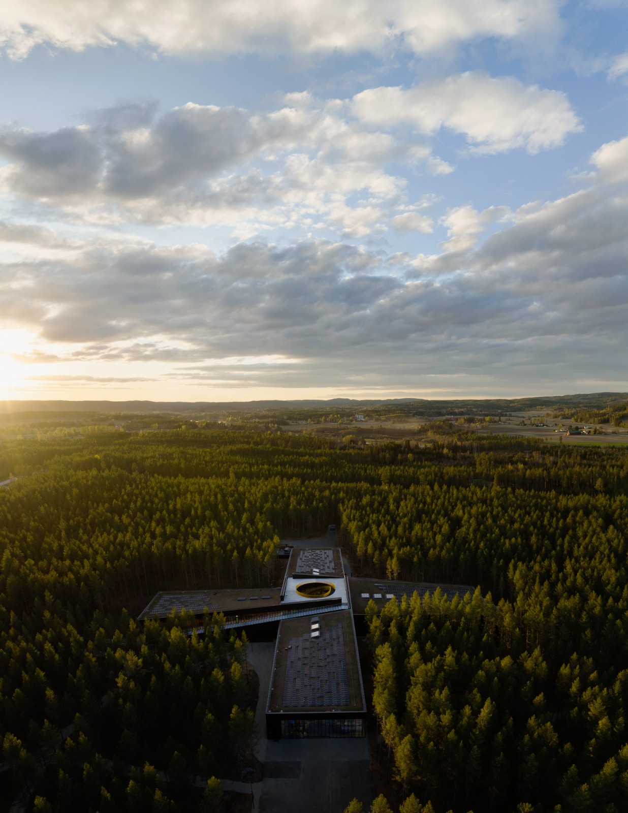 工厂屋顶覆盖着天然的森林植被,与为建筑提供能源的太阳能板共存。屋顶将全年面向所有人开放。在这里,参观者可以亲近工厂,观看生产过程,并体验美丽的自然环境。在一天中的任何时候都可以通过四个翼楼的宽大窗户看到工厂的各个部分。游客可以走到外侧的斜坡上,一览建筑内部和周围的松树林,那里有一个徒步小径组成的大型网络。