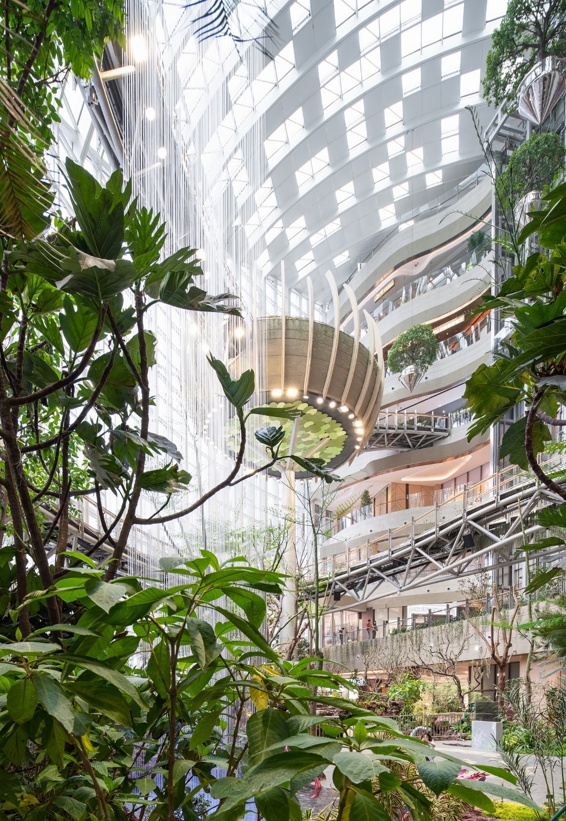 沐光森林-通高的植物园与商业动线水平及竖向多维度互相渗透、与商业空间的无缝连接,餐饮设于顶部2 层,其他开放式商铺设于其他层,通过细致的视线规划及空间营造,让植物园的绿色在横向空间中最大限度延展和互动。2条蜿蜒连桥各自分别连接2个不同的楼层,使得人们能够徜徉于树冠之间沉浸式的体验生态之趣。 植物园内的主题采用热带雨林海洋生命之源的故事线并种植了丰富多样的植物,结合瀑布和空中装饰吊树,创造出恢弘非凡的体验。