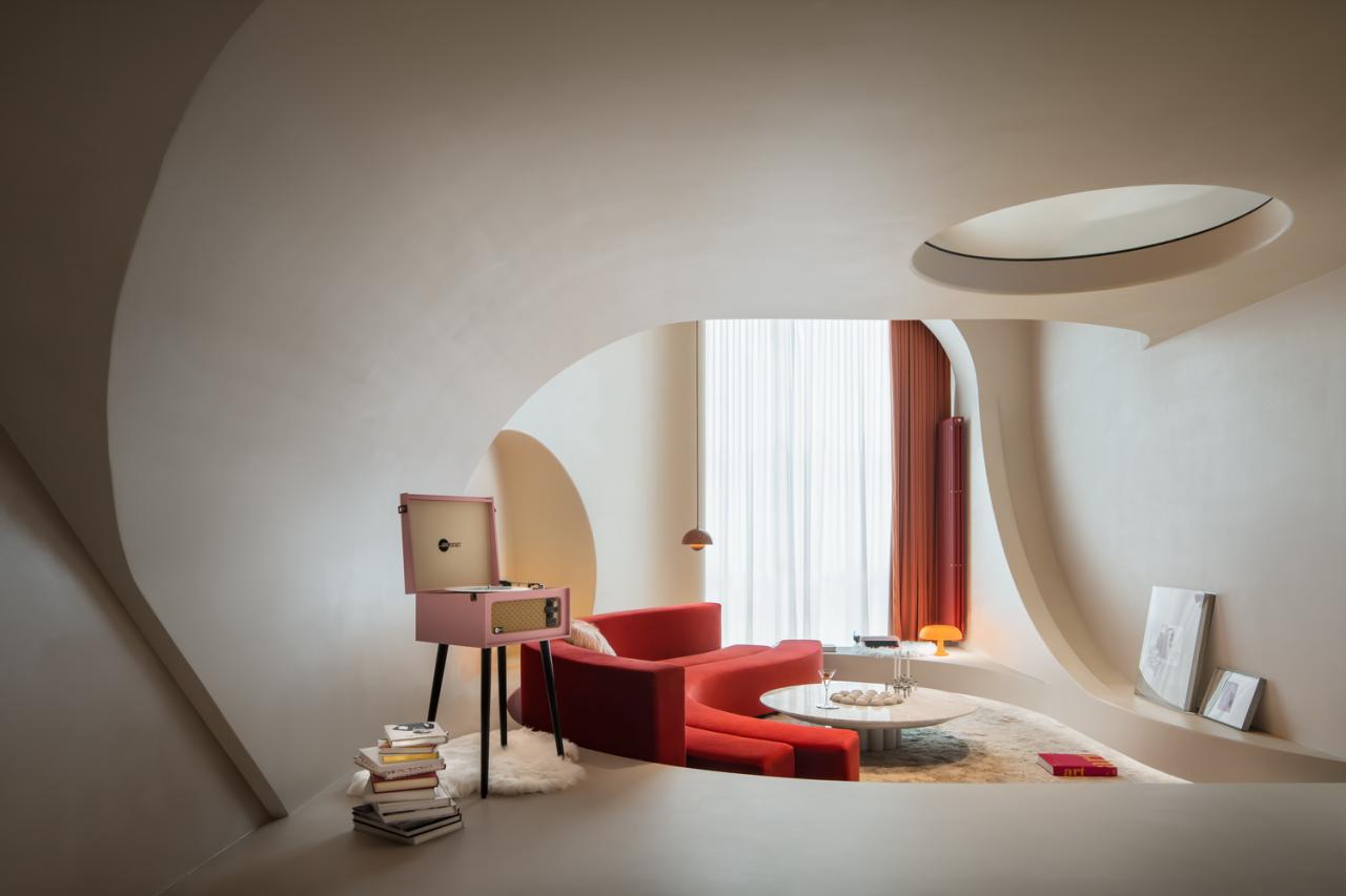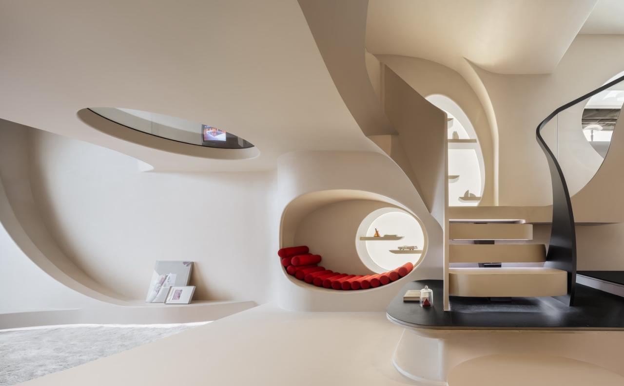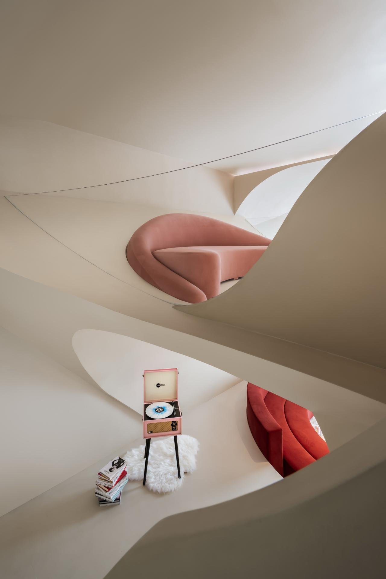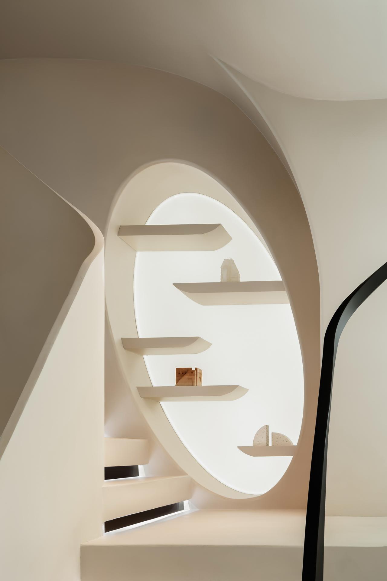 游走的弧线形成天然的台阶,与曲线勾勒的天花板一同划界出另一片天地。精致的形体细节勾勒出客厅的挺拔与内敛,流动萦绕的光影化作建筑的回响,像是穿越时空的穹廊。