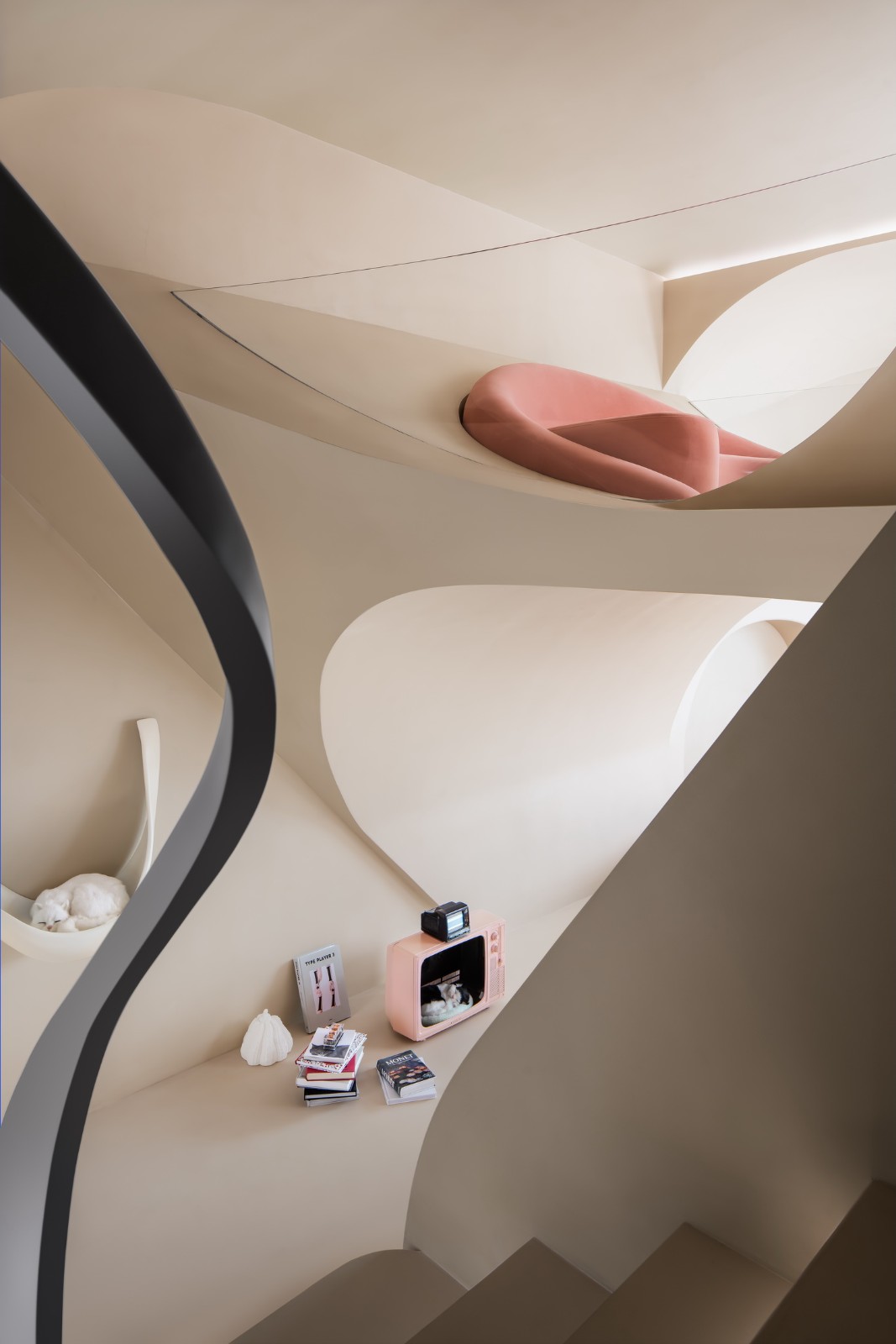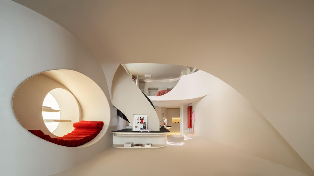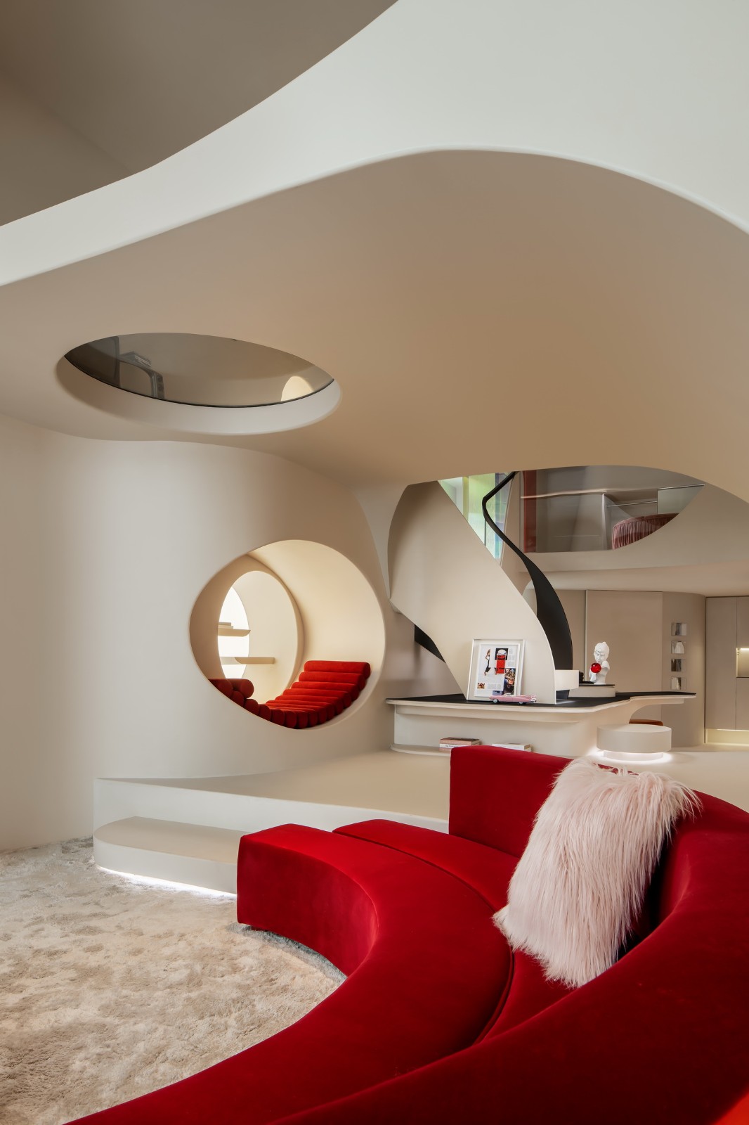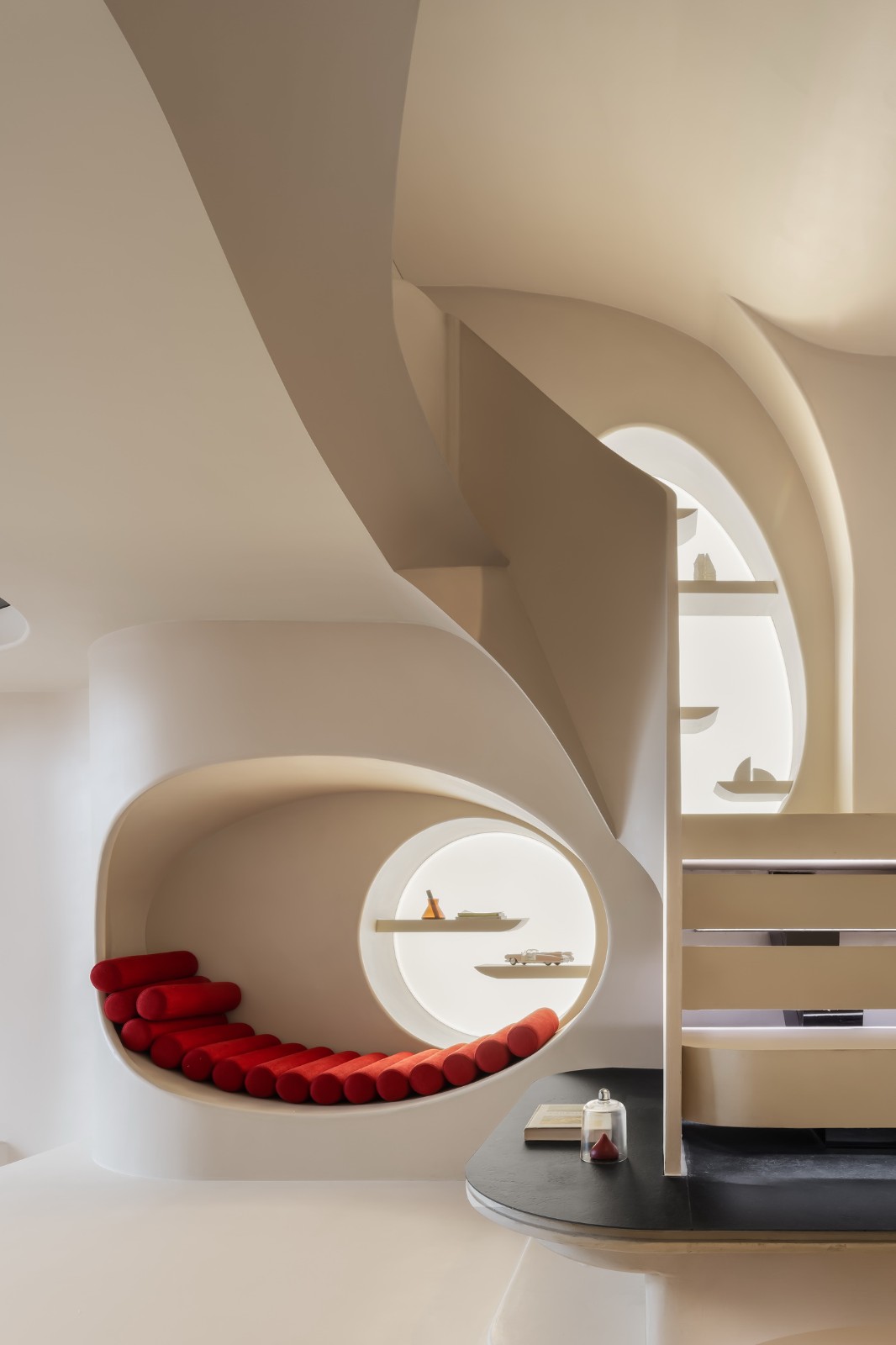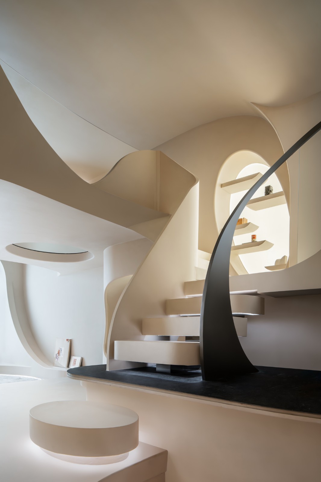 游走的弧线形成天然的台阶,与曲线勾勒的天花板一同划界出另一片天地。精致的形体细节勾勒出客厅的挺拔与内敛,流动萦绕的光影化作建筑的回响,像是穿越时空的穹廊。