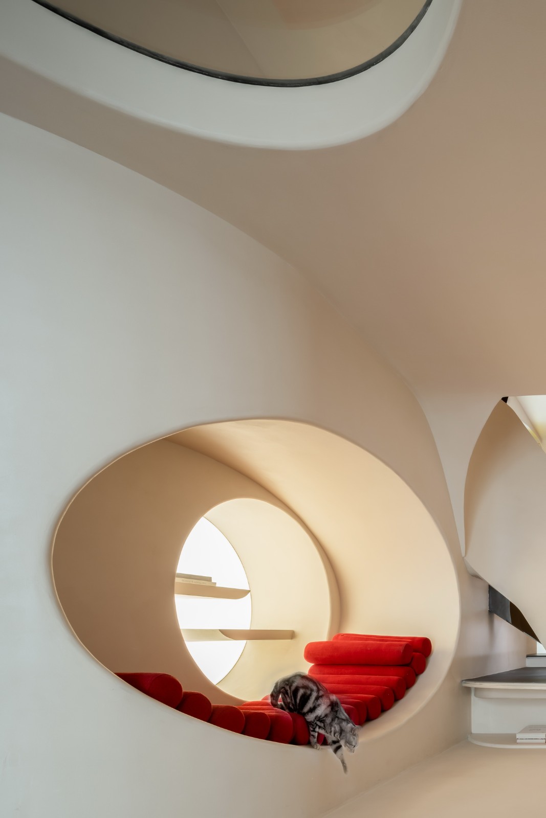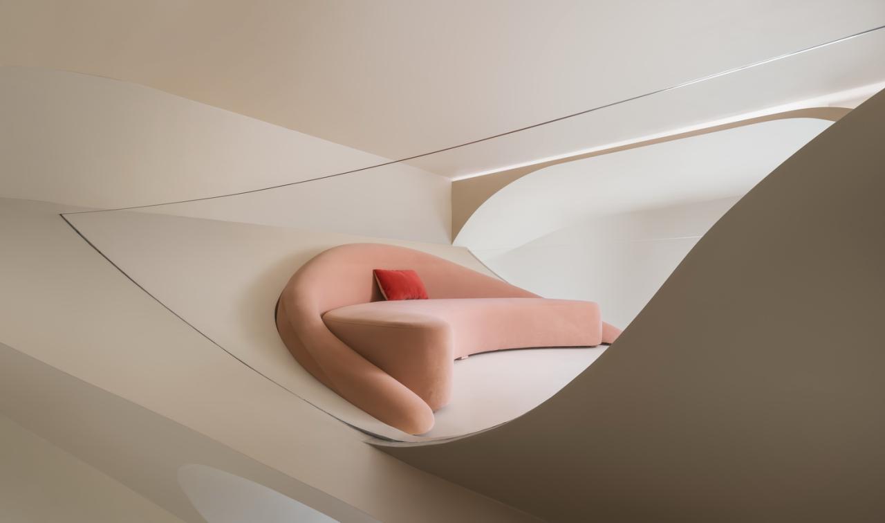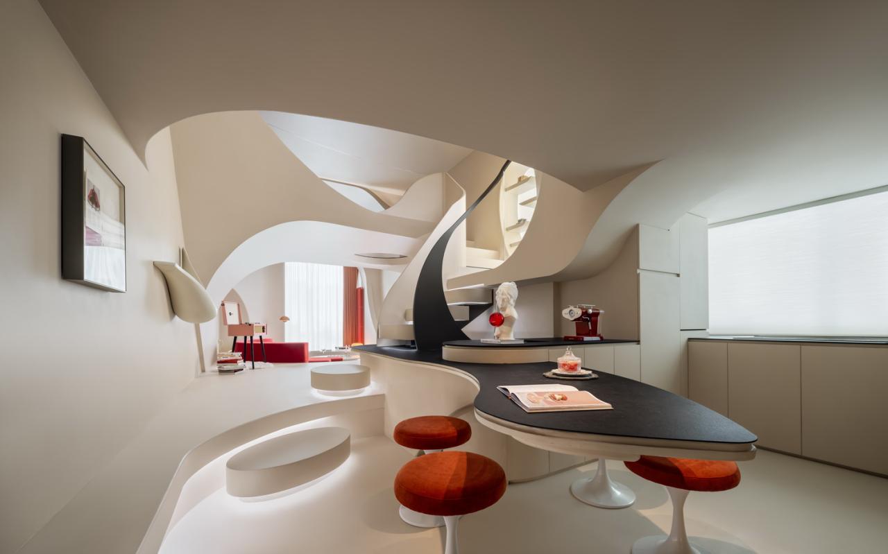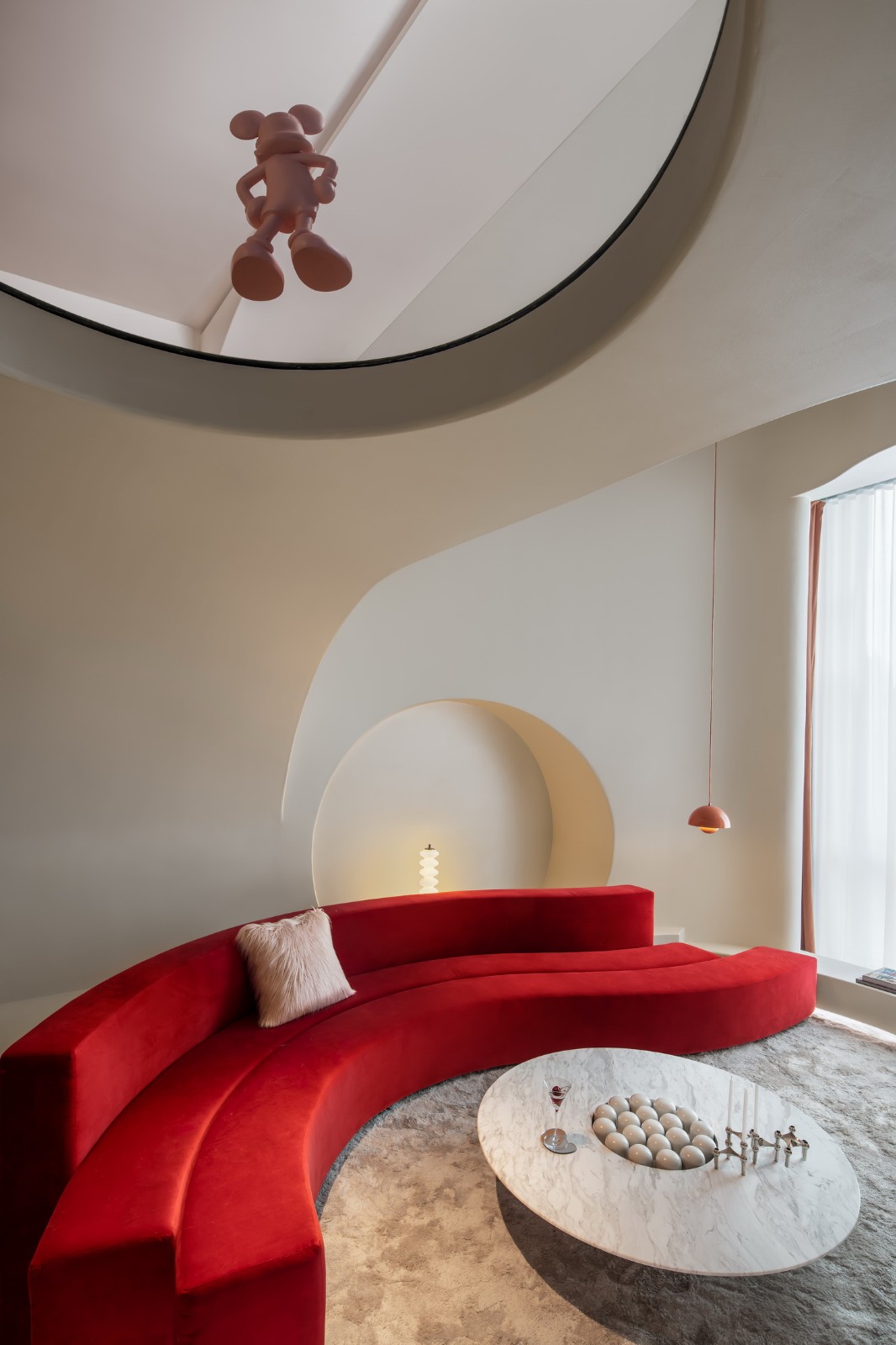 游走的弧线形成天然的台阶,与曲线勾勒的天花板一同划界出另一片天地。精致的形体细节勾勒出客厅的挺拔与内敛,流动萦绕的光影化作建筑的回响,像是穿越时空的穹廊。