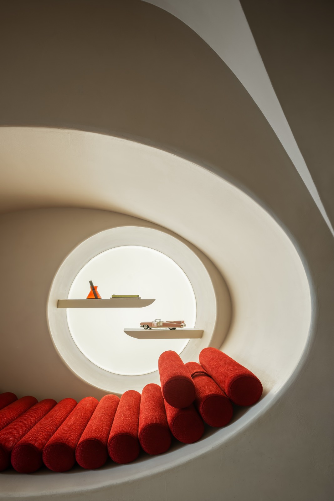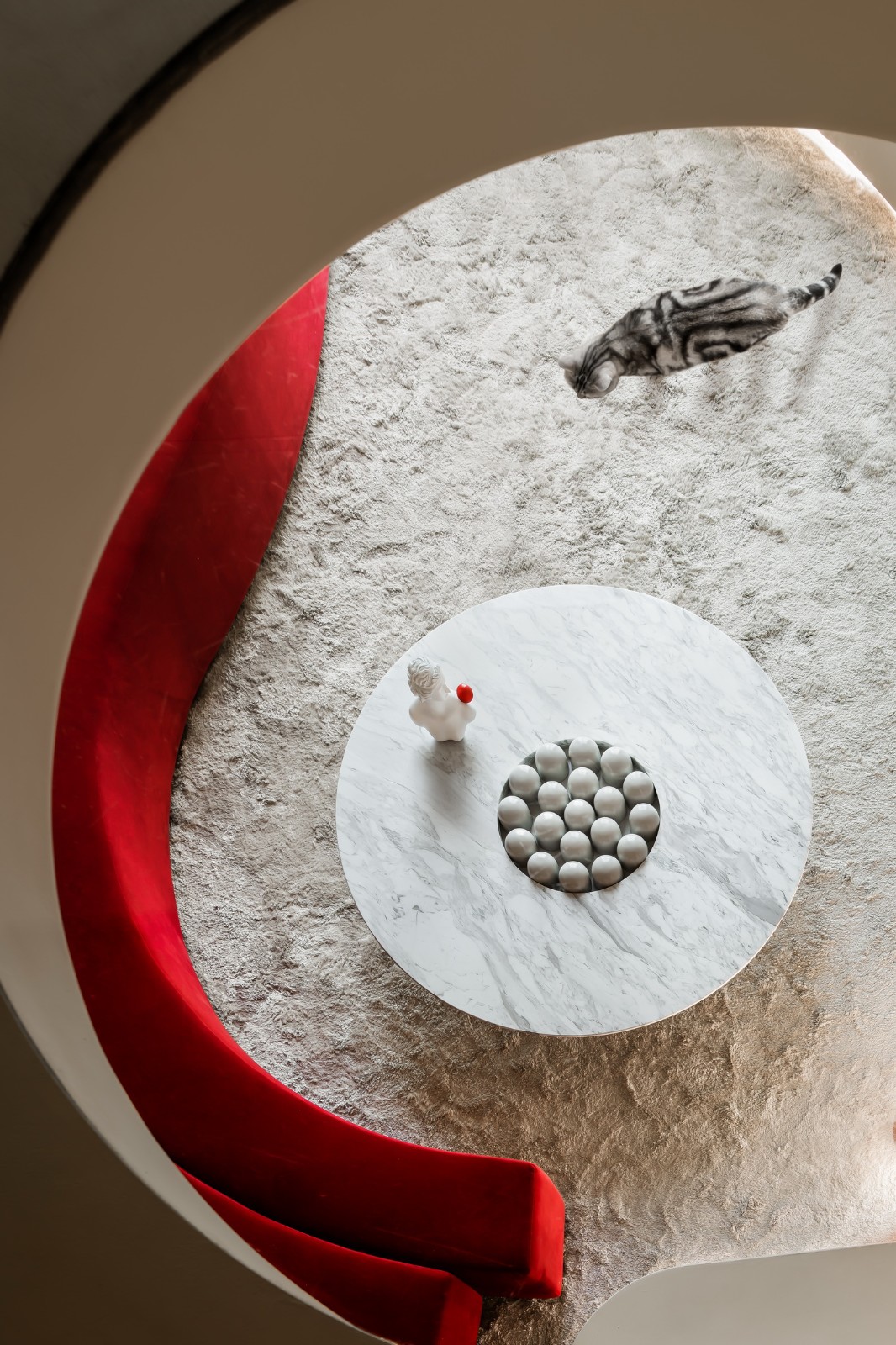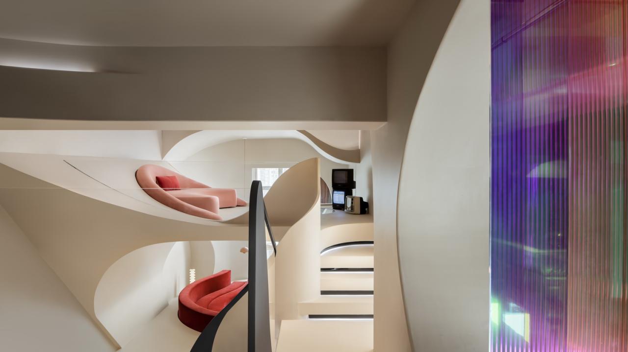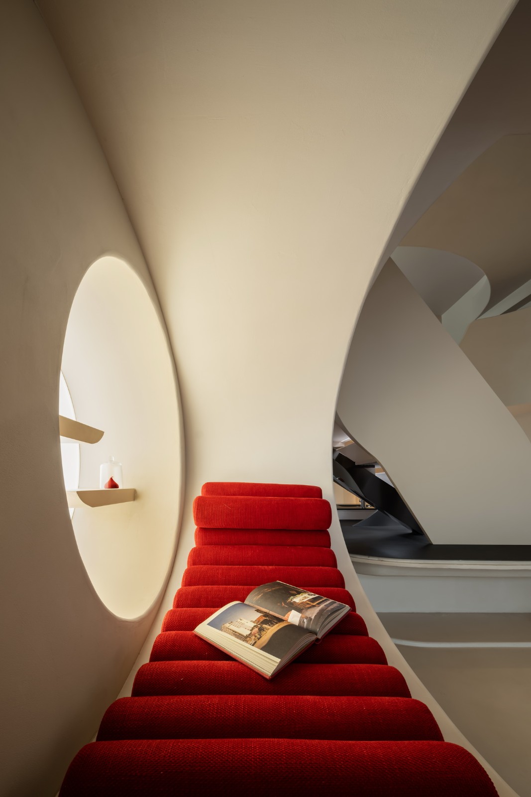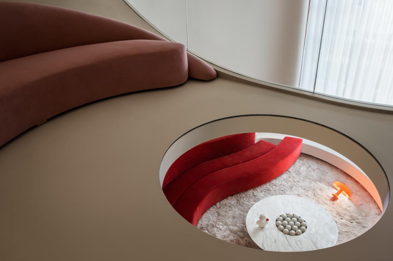 弧形沙发自带慵懒闲逸的气氛,或随意依靠或席地而坐。圆形玻璃在这里继续充当一二楼之间的功能划界与情绪脉连,透而不通,聚而不合,为空间凭添独特的节奏感与美学张力。