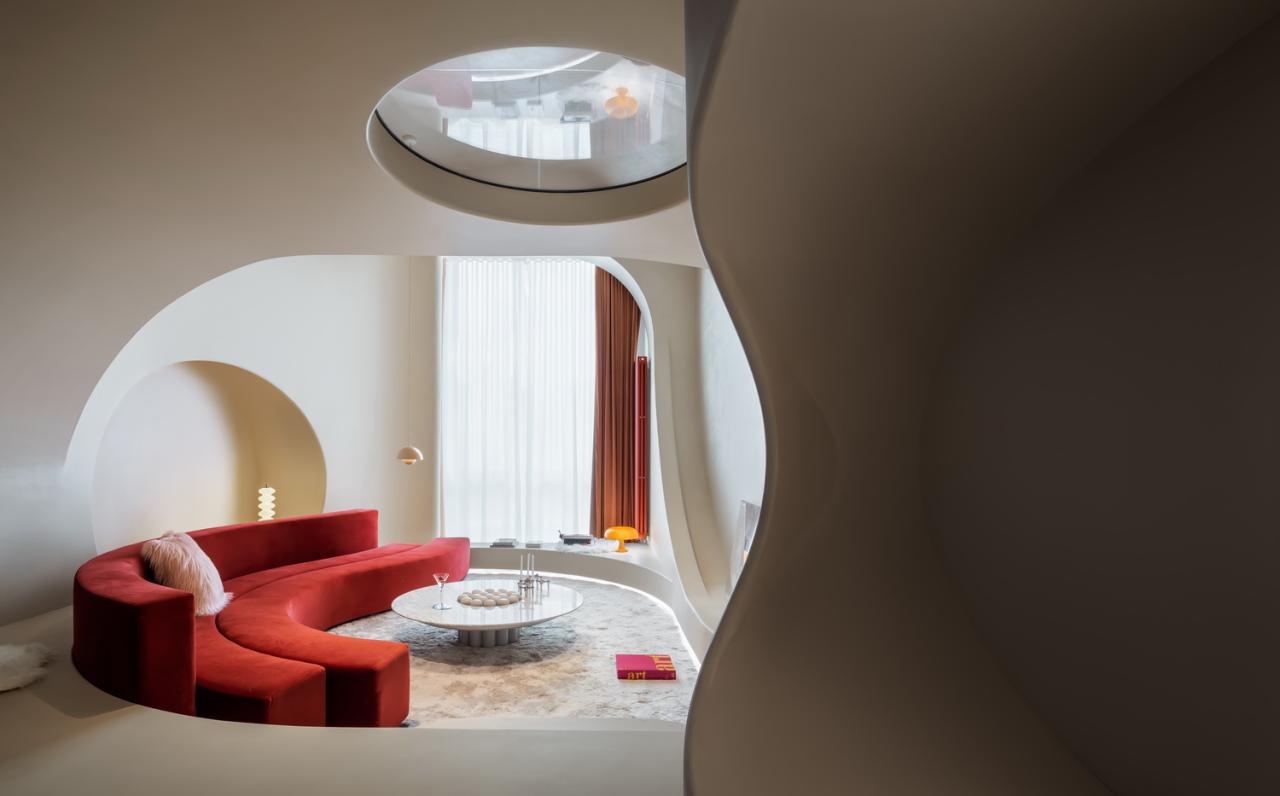 嵌入式手法打造的穴居空间,亦巧妙完成了餐客厅之间的功能衔接。将所有的野奢趣意与柔情诗意,一同化境。在短暂的小憩中,浑然忘却时间,也忘却自己。似原始森林中的穴居者、乘着宇宙飞船遨游太空的旅行家,又似静谧安魂曲中的一章。