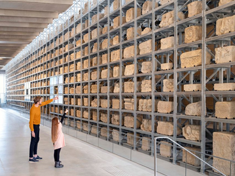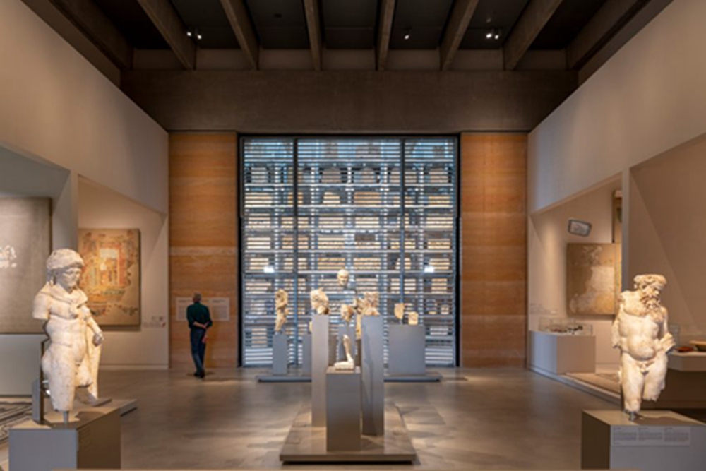 格子架是可重新配置的,允许公众透过修复空间,观察考古学家和研究人员的工作。悬在博物馆上方的大型混凝土屋顶高出高侧窗,并被灯井刺穿,通过大型玻璃间隔过滤整个博物馆的光线。从外部看,屋顶为博物馆周围的一系列走道提供了庇护。