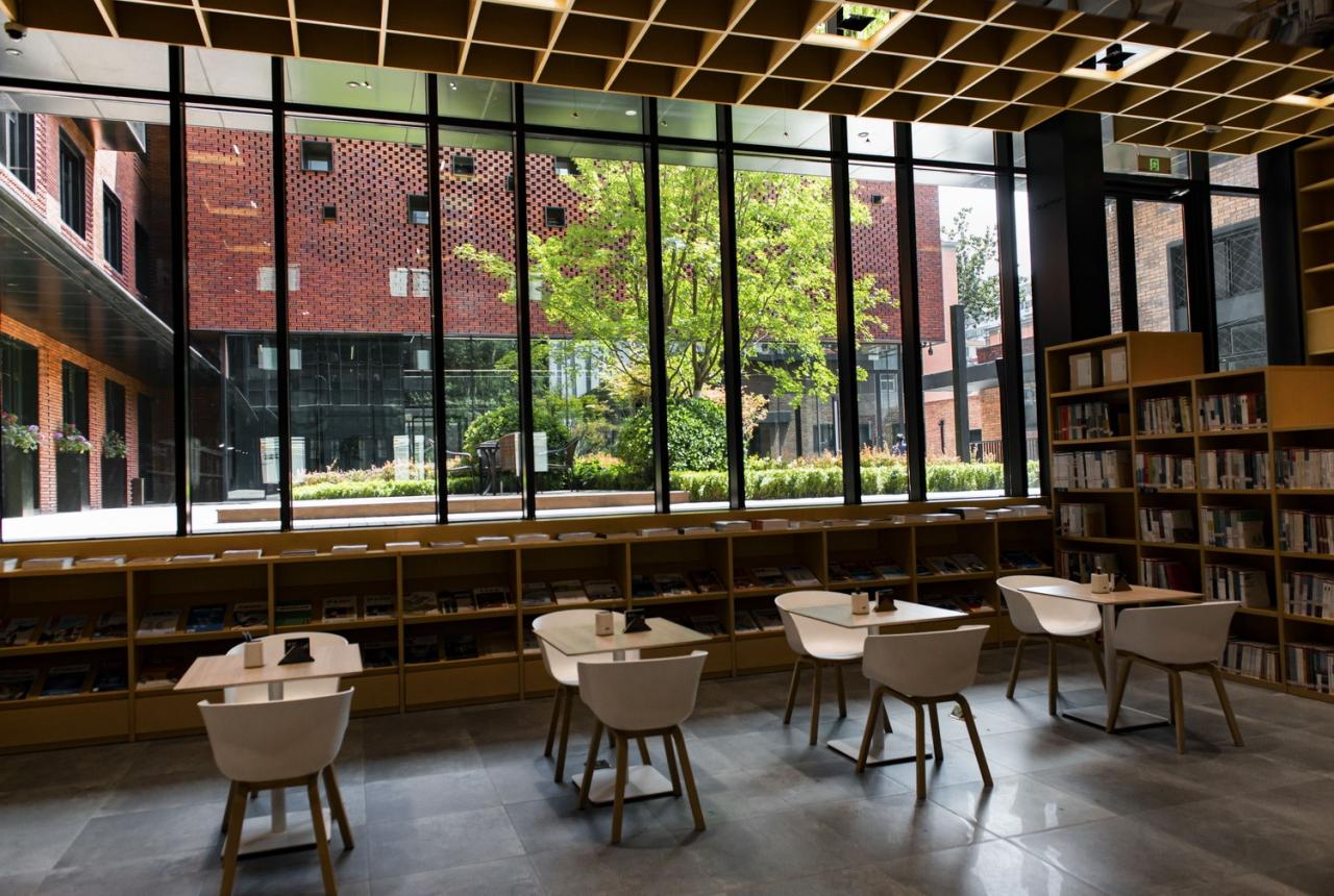穿越建筑的主门厅就可以看到一个静谧的内部庭院,既是门厅的视线延伸,也是北侧图书馆的借景。庭院虽小,却能清晰感知四季更替,既保持了空间的联系,又将景观通过玻璃幕墙延展到室内,室内外互相借景、浑然一体。