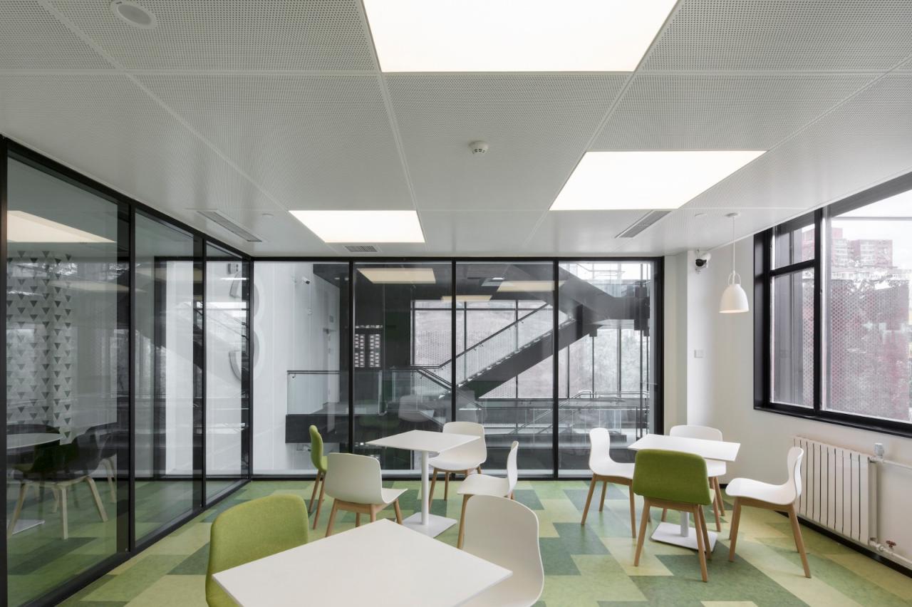 建筑原有的地下人防工程进行保留加固,在地下结构之上搭建钢结构框架,拆除原有的地上砖混结构体系,将小开间的空间体系转换为适应现代办公的开敞办公体系。项目改造赋予建筑丰富的新功能:健身房、多功能厅、咖啡厅、展厅、图书馆、学术报告厅等,为员工健康工作提供物理空间和柔性支持。办公区里,私密电话间,小型讨论室、中型会议厅、休闲水吧、岛式卡座,带来不同场景的工作体验。