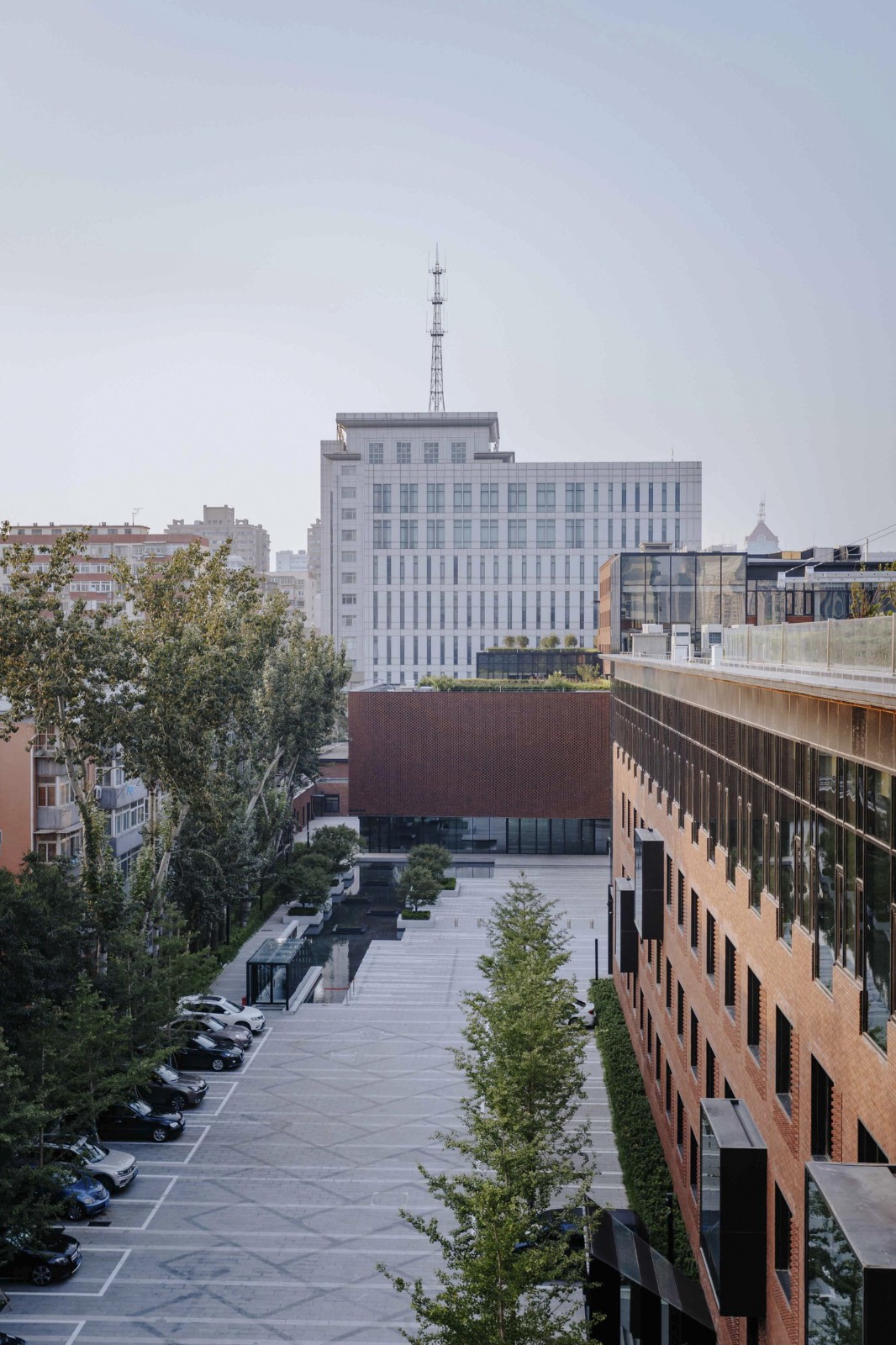 庭院一直以来都是中国传统建筑的一大特征,到了近现代,人们被各种高楼等现代建筑所包围,庭院也就成为了一大奢望。所以我们再此次改造中,将景观庭院重新引入场地。改造前的场地的一大困扰点就是办公楼与毗邻的居民楼之间距离较窄,因此本次改造减少了机动车停车数量,将有限的空间进行景观营造,既创造了舒适宜人的户外交流空间,也以柔性的方式阻隔了对面的居民楼。