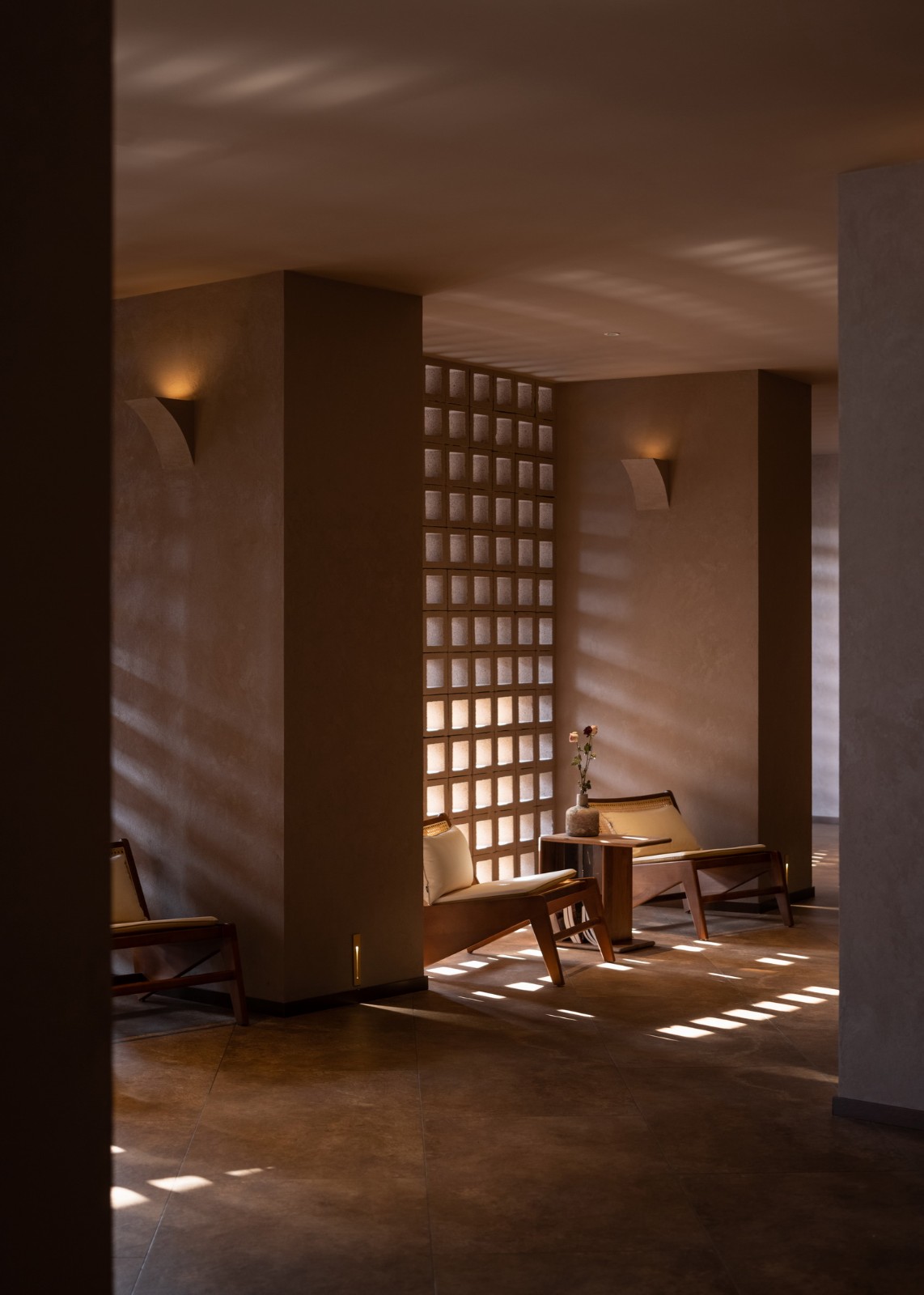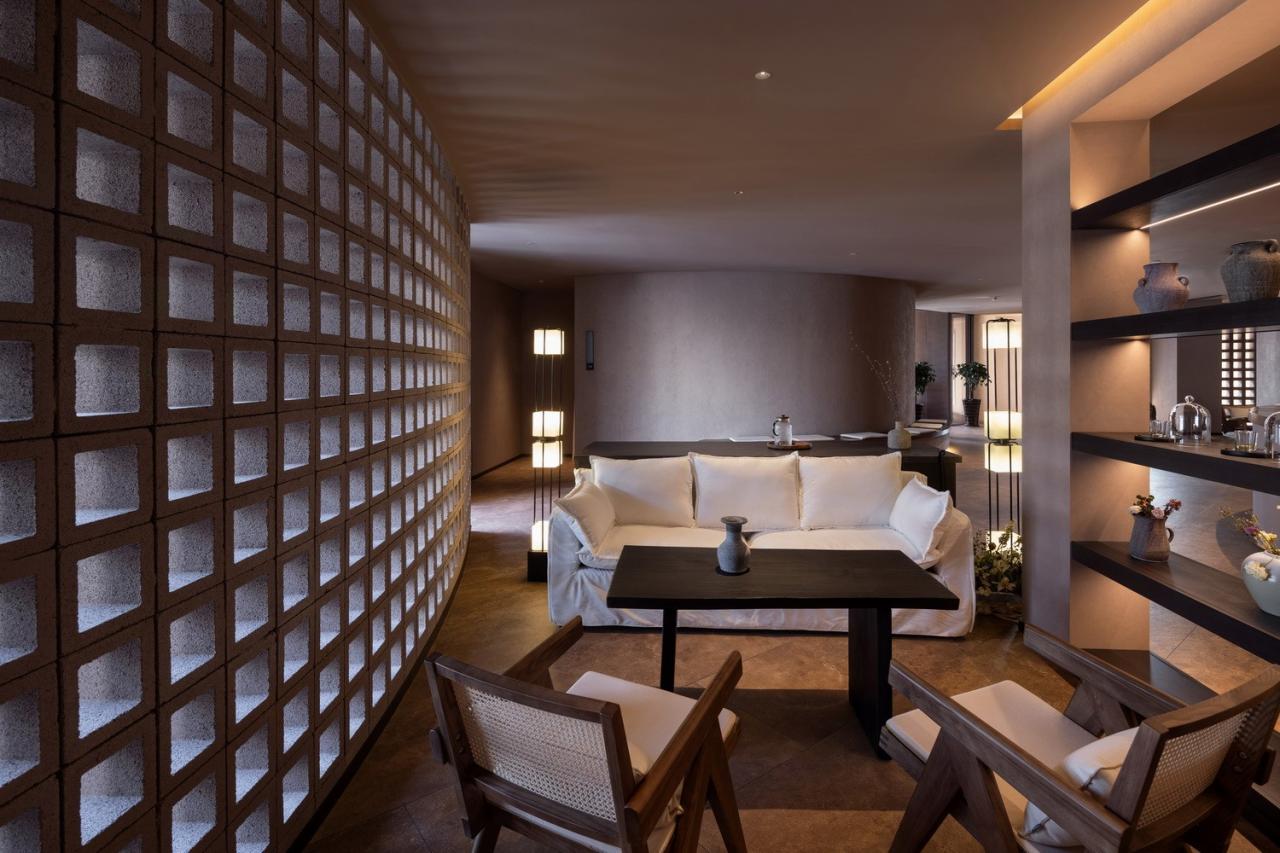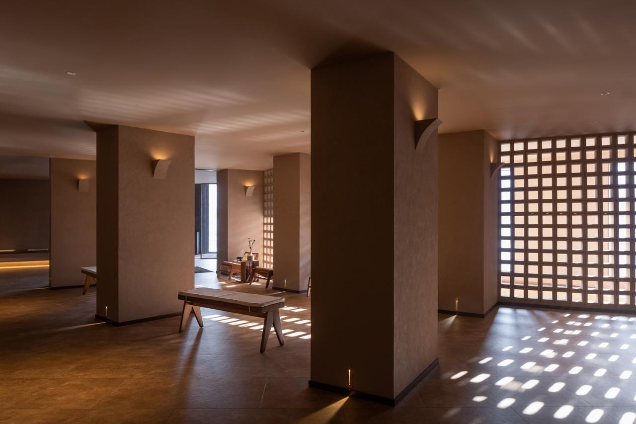 室内营造出静谧氛围——清晨阳光透过镂空砖洒向室内水面上,偶尔间,水面的涟漪反射到顶面,焚香净手,沉香山子,宛如,嫩寒清晓,行孤山篱落间。