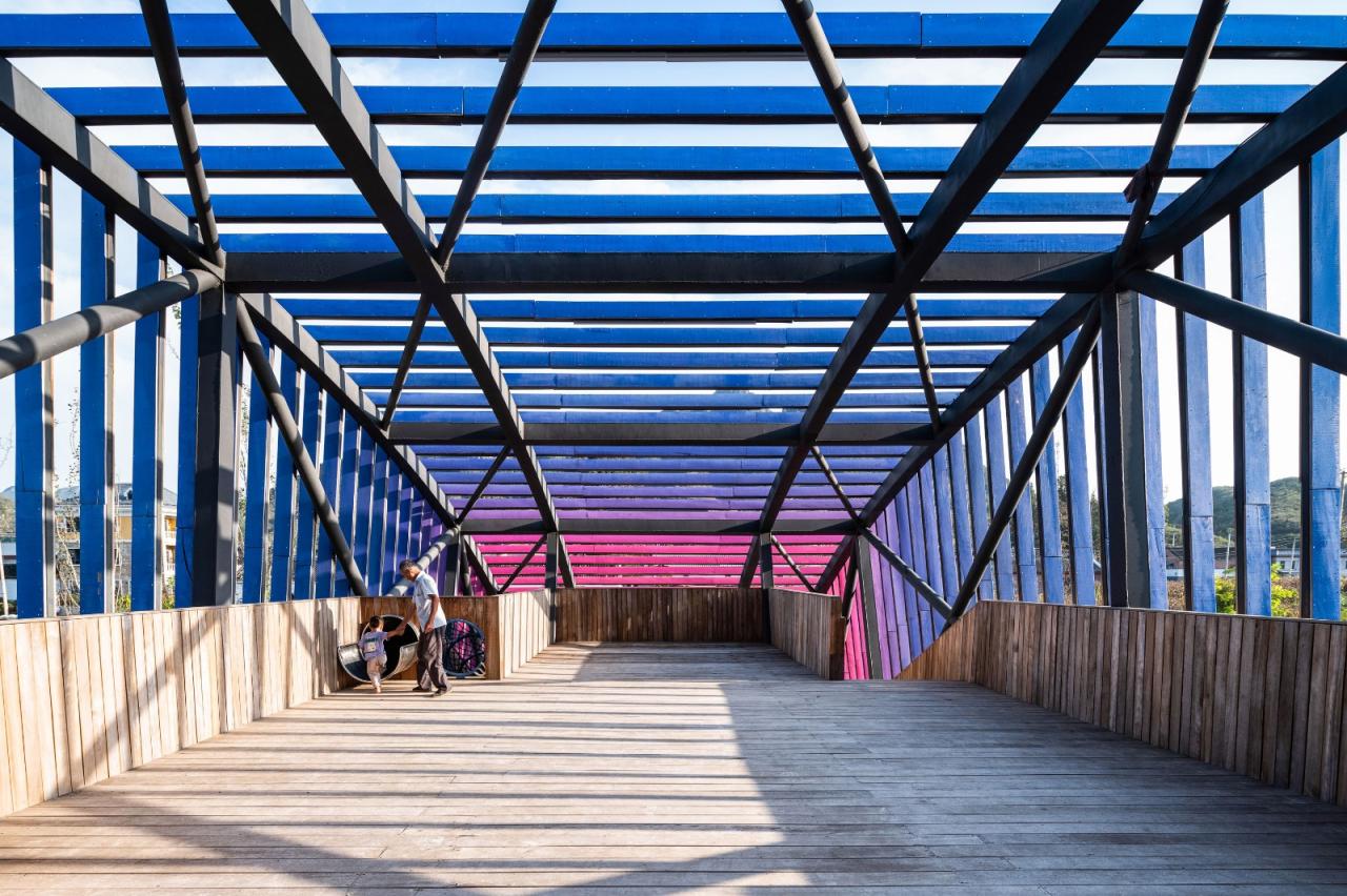 路的另一侧,「一座农桥」成为离开「田岗·知行村」的出口,它将原始场地中危险的涵洞桥转型成为可运营、可互动、可游玩的「价值之桥」,亦以天外来客般的五光十色与乡村的质朴形成对比,遥想着「城市的光怪陆离」。自桥而出,田园市集成为离村的必经之地,游览动线由此完成闭环。