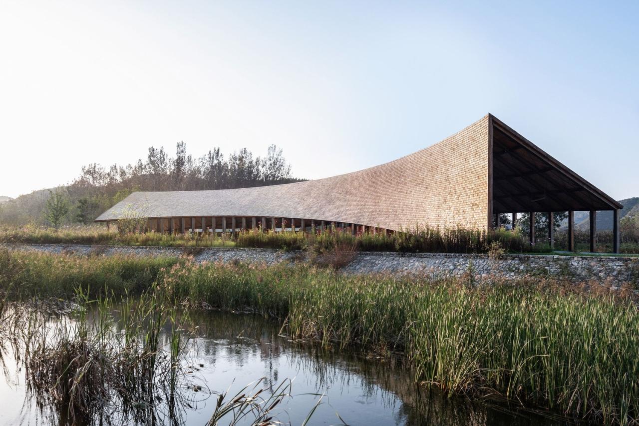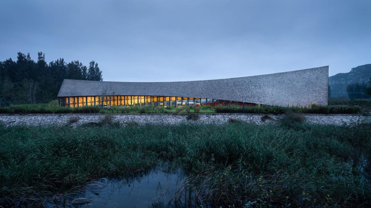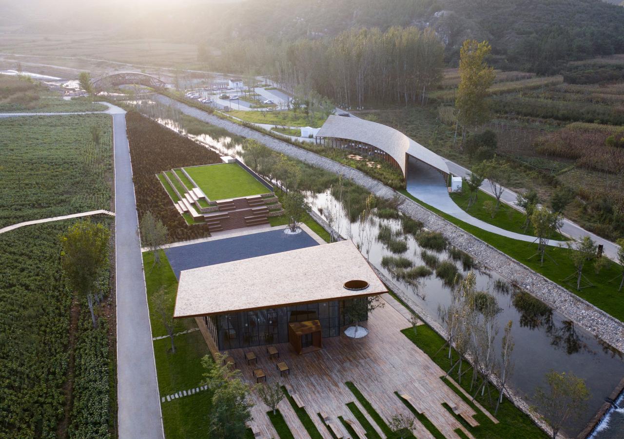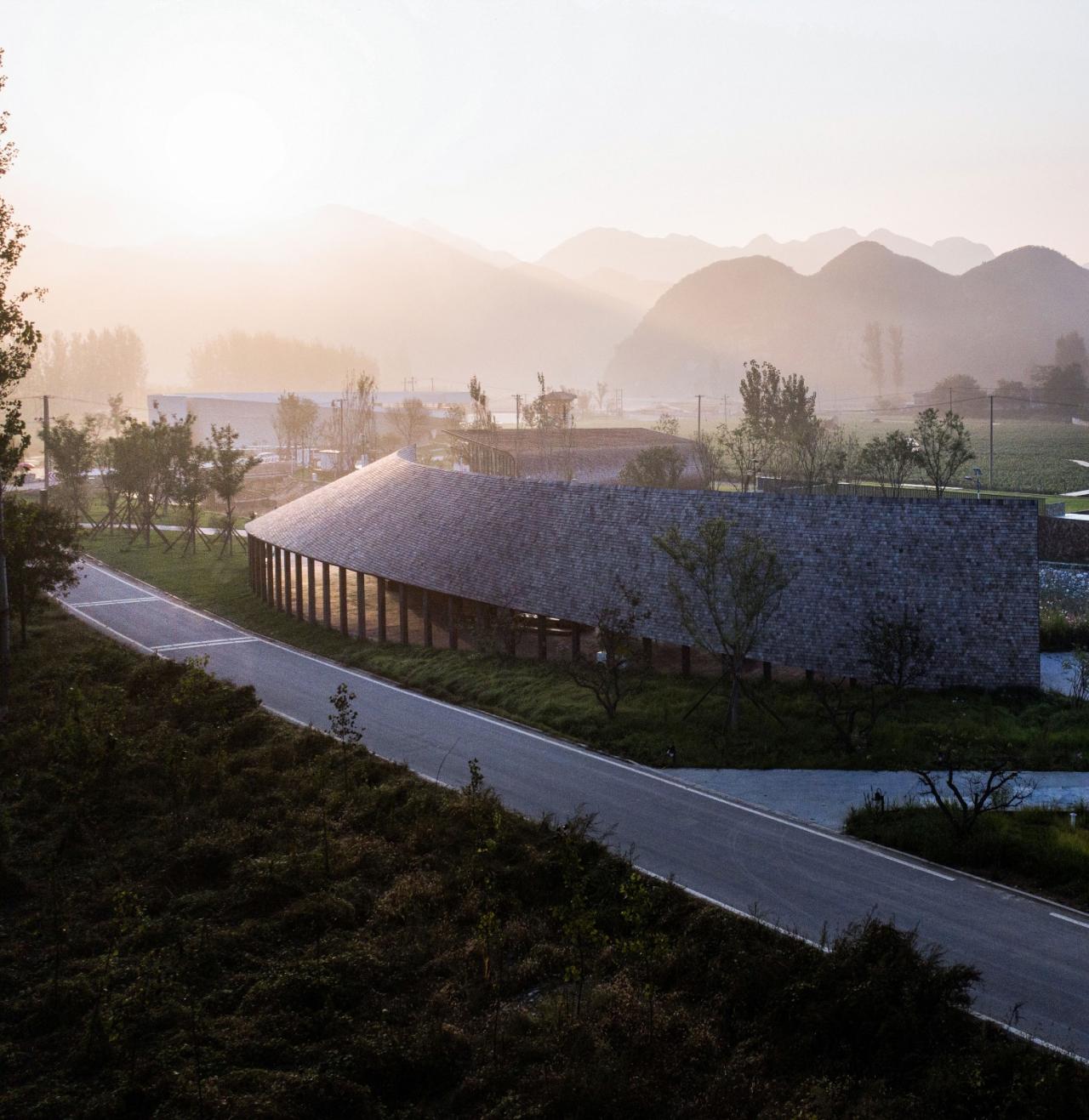 与田园市集对河而望的是一座「田园大讲堂」,它更贴近村落,承担村内外信息交互的功能,亦作为「乡村振兴」的重要发声地。再至村内,艺术中心、牌楼和乡村会客厅形成三角关系,围合出大片具有景观性的农田和「大地艺术」的试验场,任天然风景与人为艺术在此自然生成、相得益彰。