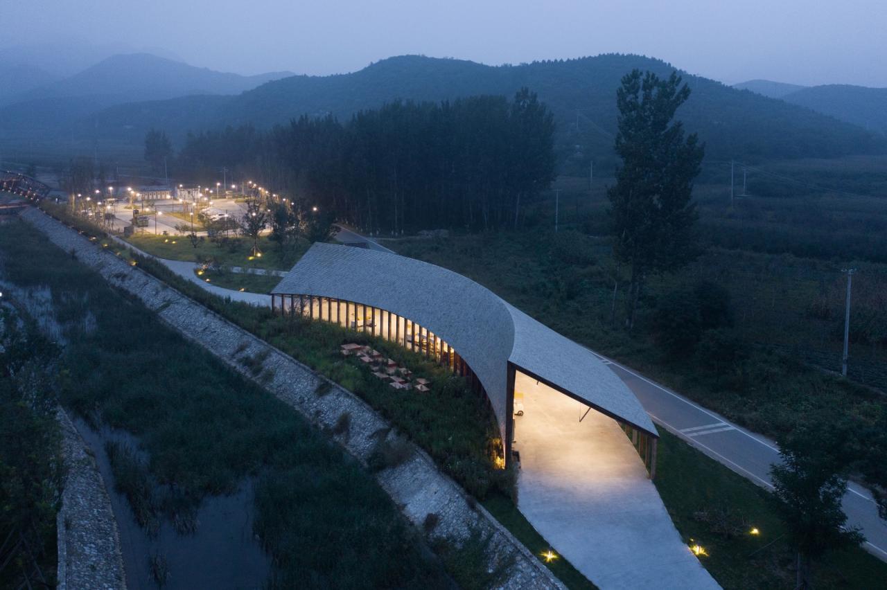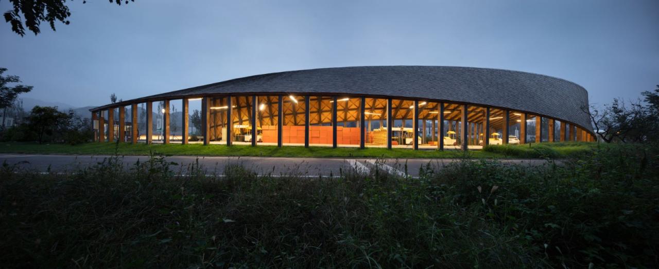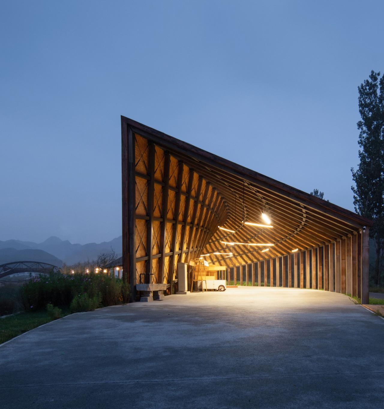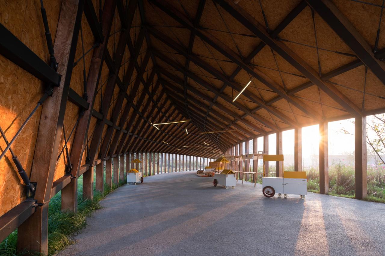 田园市集整体由环柱削切而来,以一道屋脊连接两个曲面,一端与地面相接,另一端则留出亲近外部的空隙,其倾斜的形态能够避免积雪、减轻屋面荷载。钢架和拉索支撑起羽翼般遮风避雨的灰空间,均匀分布的柱体随着屋面的高低形成空间秩序的细微变化,颇具韵律,实现美学与功能的合二为一。
